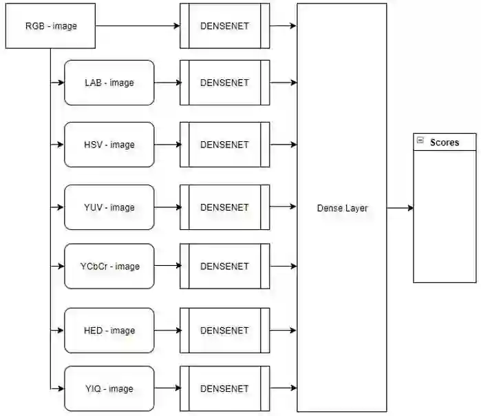 Image classification is a fundamental application in computer vision. Recently, deeper networks and highly connected networks have shown state of the art performance for image classification tasks. Most datasets these days consist of a finite number of color images. These color images are taken as input in the form of RGB images and classification is done without modifying them. We explore the importance of color spaces and show that color spaces (essentially transformations of original RGB images) can significantly affect classification accuracy. Further, we show that certain classes of images are better represented in particular color spaces and for a dataset with a highly varying number of classes such as CIFAR and Imagenet, using a model that considers multiple color spaces within the same model gives excellent levels of accuracy. Also, we show that such a model, where the input is preprocessed into multiple color spaces simultaneously, needs far fewer parameters to obtain high accuracy for classification. For example, our model with 1.75M parameters significantly outperforms DenseNet 100-12 that has 12M parameters and gives results comparable to Densenet-BC-190-40 that has 25.6M parameters for classification of four competitive image classification datasets namely: CIFAR-10, CIFAR-100, SVHN and Imagenet. Our model essentially takes an RGB image as input, simultaneously converts the image into 7 different color spaces and uses these as inputs to individual densenets. We use small and wide densenets to reduce computation overhead and number of hyperparameters required. We obtain significant improvement on current state of the art results on these datasets as well.