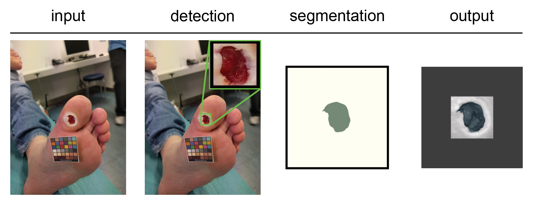 翻译:慢性伤口会严重影响生活质量。如果管理不当,它们会严重恶化。基于图像的伤口分析有助于通过量化与愈合有关的重要特征来客观地评估伤口状况。然而,伤口类型、图像背景构成和捕捉条件的高度异质性对伤口图像的稳健分解提出了挑战。我们展示了检测和分层(DS),这是一种深层学习方法,用高一般化能力制作伤口分解图。在我们的方法中,专门的深神经网络检测了伤口位置,将伤口从无信息化背景中分离出来,并计算了伤口分解图。我们使用一个带有糖尿病脚溃疡图像的数据集评估了这一方法。为了进一步测试,使用了4套来自不同身体位置的伤口类型更为多样的辅助独立数据集。马修斯的关联系数(MCC)从计算全图像的分解过程的0.29提高到0.85,同时将检测和分解结合起来。在测试从补充数据集中提取的伤口图像时,DS方法将中中值的中中值的内核分器从0.17提高到0.85。此外,DS方法使数据部分的分数培训得以进行低段。