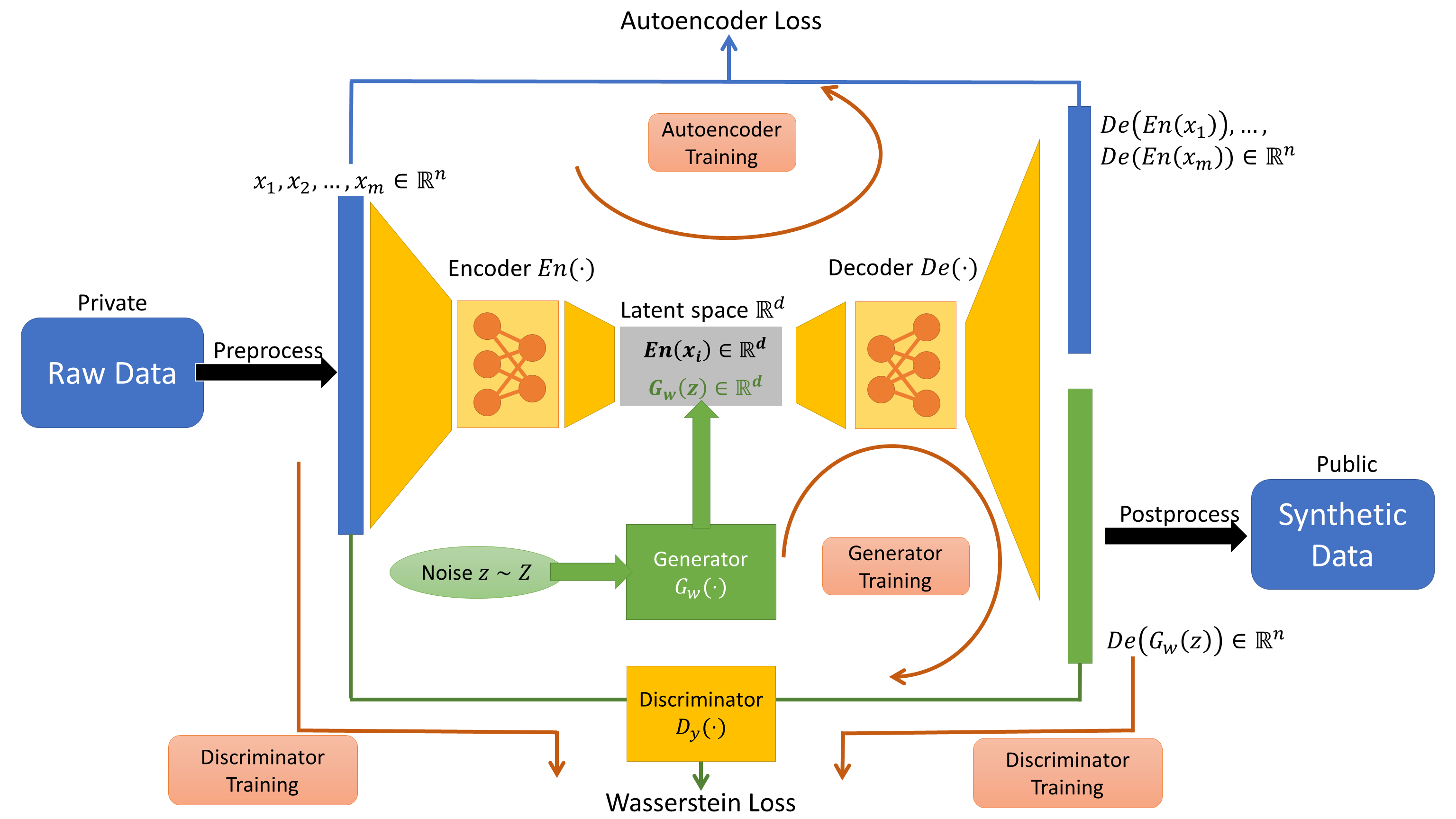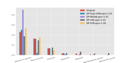 翻译:我们引入了用于合成数据生成的DP-auto-GAN框架,这一框架将自动编码器的低维代表性与基因反转网络(GANs)的灵活性结合起来,可以用于原始敏感数据和私人培训生成合成数据的模型,这种模型将满足原始数据的类似统计特性,这种学习模式可以产生任意数量的合成数据,然后由于处理后对不同隐私的保证,可以自由分享这些数据。我们的框架适用于无标签的混合型数据,其中可能包括二元数据、绝对数据以及实际价值的数据。我们实施这一框架,既包括二元数据(MIMIC-III),也包括混合型数据(ADULT),并将这一框架的性能与在不受监督的环境中测量的现有私人算法进行比较。我们还引入新的定量指标,能够检测合成数据的多样性或缺乏多样性。
