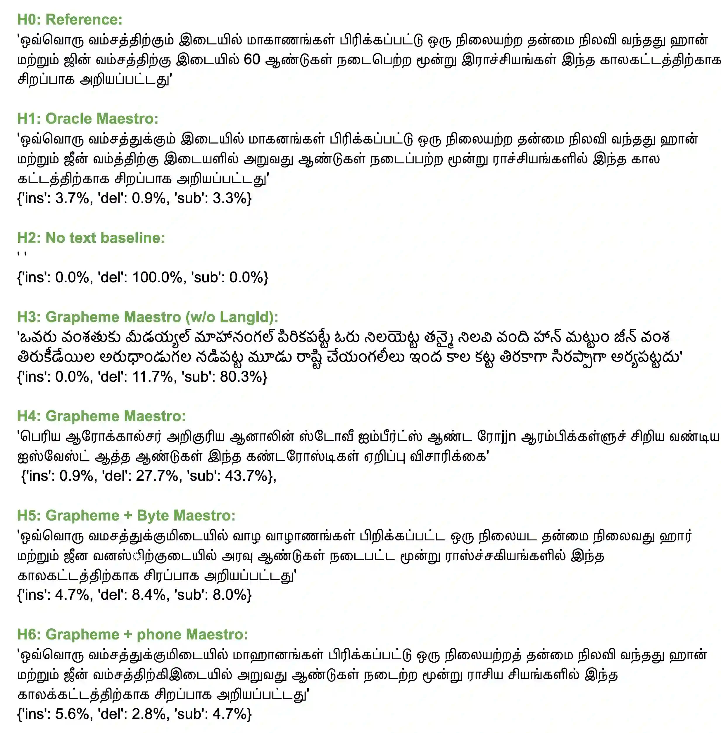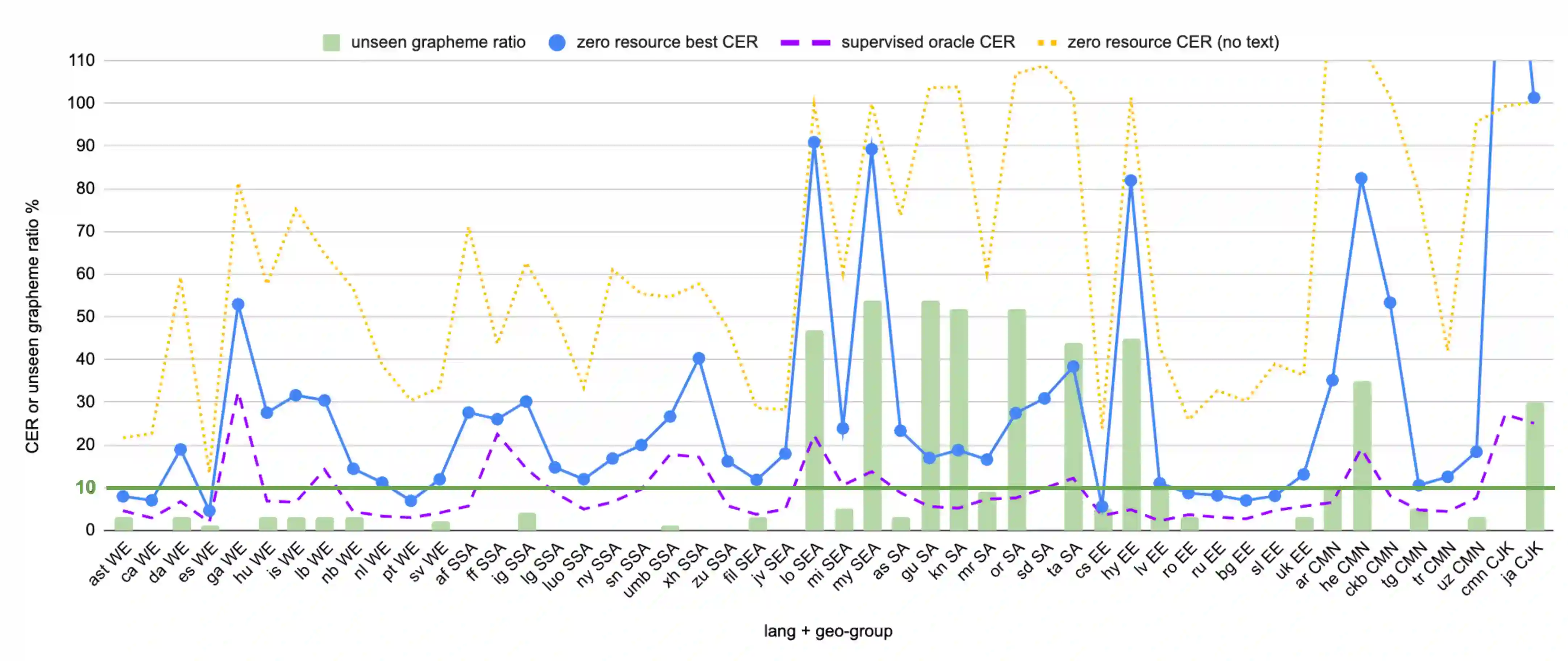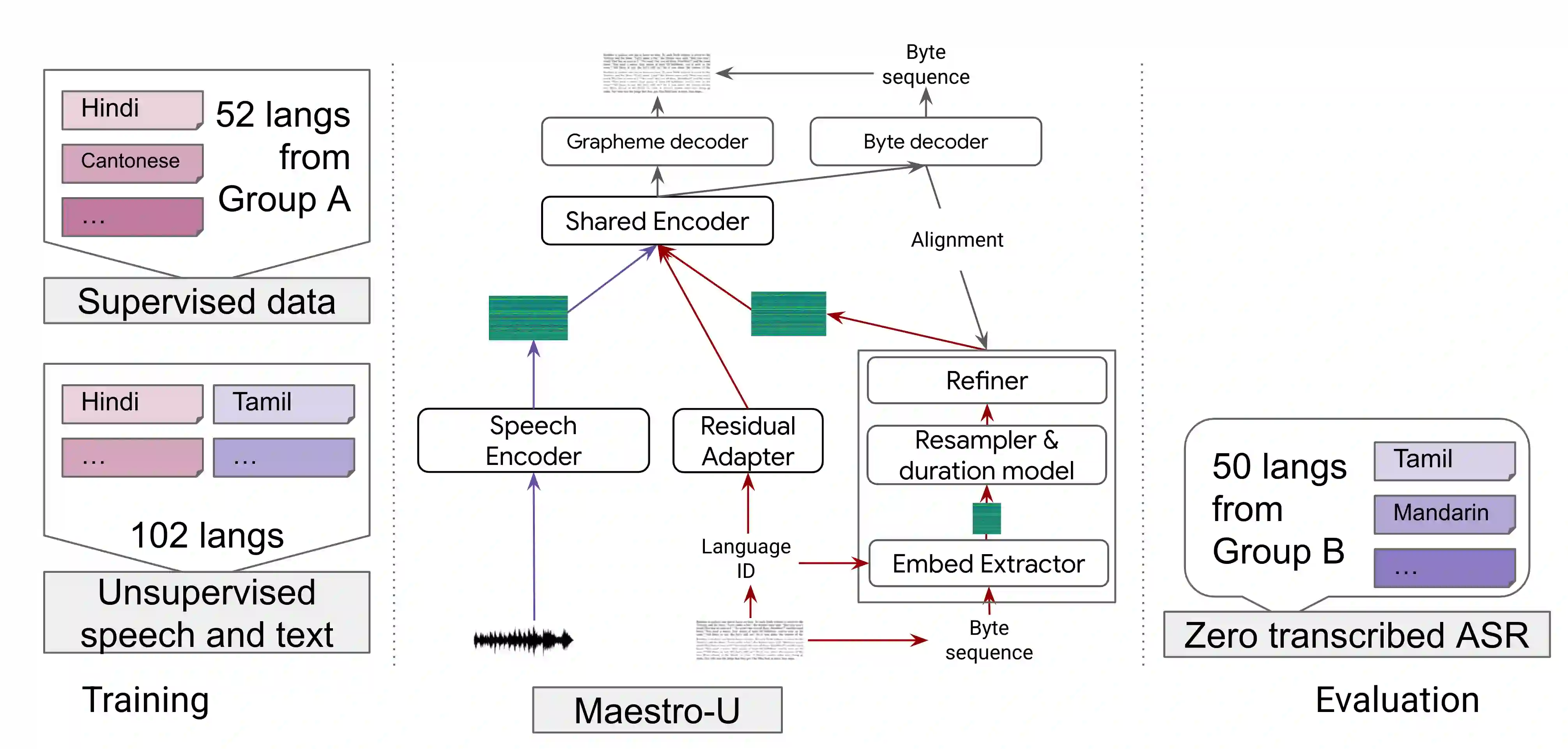 翻译:培训最先进的自动语音识别(ASR)模式通常要求大量转录语音。在这项工作中,我们证明可以利用一种模式式配对的联合语音和文本模式来培训大规模多语种的ASR模式,无需对一些语言进行任何监督(手动转录)的演讲。本文探讨了在大规模多语种、零监督的演讲、真实世界环境中使用联合学习的演讲和文字表述方式,以扩大ASR所涵盖的一套语言,仅使用目标语言的未加标记的演讲和文本。我们利用FLEURS数据集,界定了涵盖102美元语言的任务,在这些语言中,可提供520美元的转录制语音和文本模式,用于培训大规模多语言的大规模多语种(手语(手语翻译)语言。首先,我们表明,通过将语音表述与字级文字表达方式和语言嵌嵌入结合起来,我们可以大幅降低语言的字符错误率(CER)从64.8 ⁇ 降至30.8 ⁇ 。 我们界定了53 ⁇ 的相对差距,第二,使用15美元转录式语言的分组,我们通过监督的磁标式将18度转换为近平调。