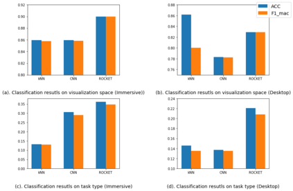 The understanding of visual analytics process can benefit visualization researchers from multiple aspects, including improving visual designs and developing advanced interaction functions. However, the log files of user behaviors are still hard to analyze due to the complexity of sensemaking and our lack of knowledge on the related user behaviors. This work presents a study on a comprehensive data collection of user behaviors, and our analysis approach with time-series classification methods. We have chosen a classical visualization application, Covid-19 data analysis, with common analysis tasks covering geo-spatial, time-series and multi-attributes. Our user study collects user behaviors on a diverse set of visualization tasks with two comparable systems, desktop and immersive visualizations. We summarize the classification results with three time-series machine learning algorithms at two scales, and explore the influences of behavior features. Our results reveal that user behaviors can be distinguished during the process of visual analytics and there is a potentially strong association between the physical behaviors of users and the visualization tasks they perform. We also demonstrate the usage of our models by interpreting open sessions of visual analytics, which provides an automatic way to study sensemaking without tedious manual annotations.