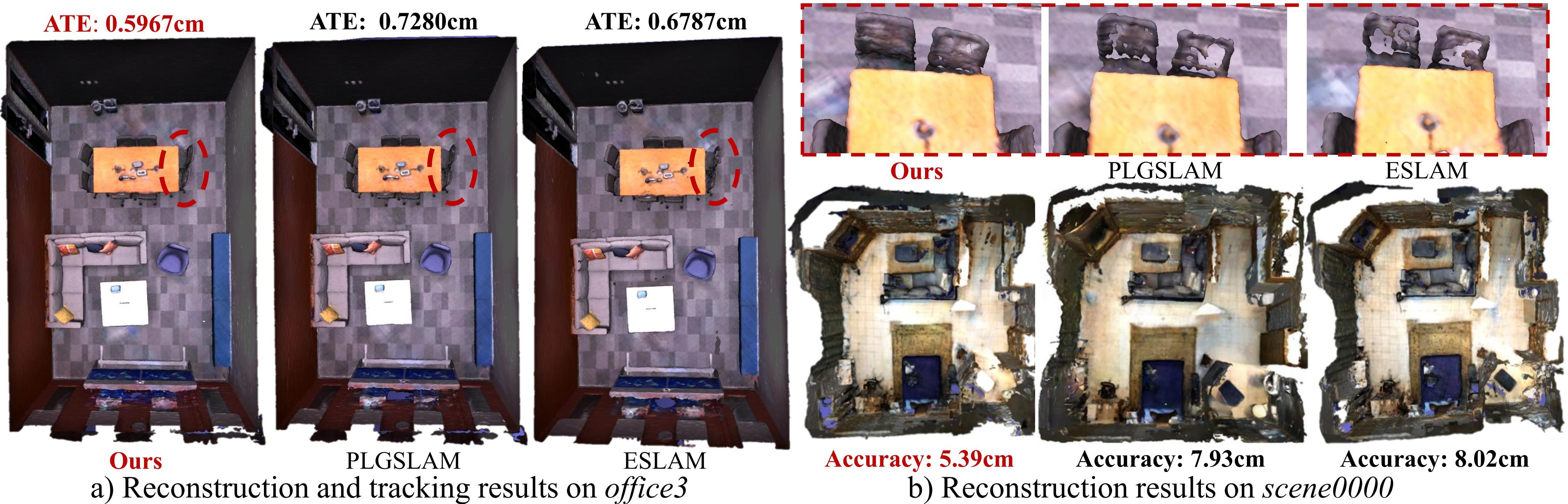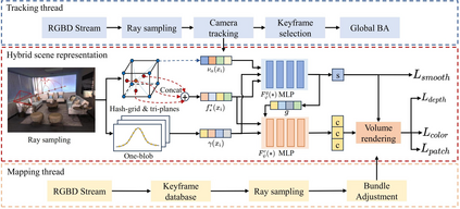 NeRF-based SLAM has recently achieved promising results in tracking and reconstruction. However, existing methods face challenges in providing sufficient scene representation, capturing structural information, and maintaining global consistency in scenes emerging significant movement or being forgotten. To this end, we present HS-SLAM to tackle these problems. To enhance scene representation capacity, we propose a hybrid encoding network that combines the complementary strengths of hash-grid, tri-planes, and one-blob, improving the completeness and smoothness of reconstruction. Additionally, we introduce structural supervision by sampling patches of non-local pixels rather than individual rays to better capture the scene structure. To ensure global consistency, we implement an active global bundle adjustment (BA) to eliminate camera drifts and mitigate accumulative errors. Experimental results demonstrate that HS-SLAM outperforms the baselines in tracking and reconstruction accuracy while maintaining the efficiency required for robotics.
