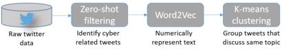 Many cyber network defense tools rely on the National Vulnerability Database (NVD) to provide timely information on known vulnerabilities that exist within systems on a given network. However, recent studies have indicated that the NVD is not always up to date, with known vulnerabilities being discussed publicly on social media platforms, like Twitter and Reddit, months before they are published to the NVD. To that end, we present a framework for unsupervised classification to filter tweets for relevance to cyber security. We consider and evaluate two unsupervised machine learning techniques for inclusion in our framework, and show that zero-shot classification using a Bidirectional and Auto-Regressive Transformers (BART) model outperforms the other technique with 83.52% accuracy and a F1 score of 83.88, allowing for accurate filtering of tweets without human intervention or labelled data for training. Additionally, we discuss different insights that can be derived from these cyber-relevant tweets, such as trending topics of tweets and the counts of Twitter mentions for Common Vulnerabilities and Exposures (CVEs), that can be used in an alert or report to augment current NVD-based risk assessment tools.