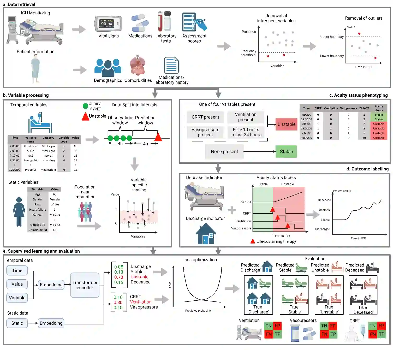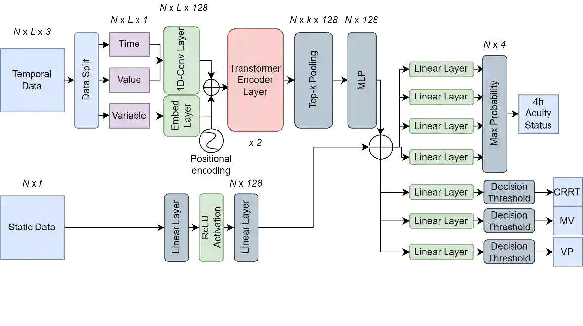 The acuity state of patients in the intensive care unit (ICU) can quickly change from stable to unstable, sometimes leading to life-threatening conditions. Early detection of deteriorating conditions can result in providing more timely interventions and improved survival rates. Current approaches rely on manual daily assessments. Some data-driven approaches have been developed, that use mortality as a proxy of acuity in the ICU. However, these methods do not integrate acuity states to determine the stability of a patient or the need for life-sustaining therapies. In this study, we propose APRICOT (Acuity Prediction in Intensive Care Unit), a Transformer-based neural network to predict acuity state in real-time in ICU patients. We develop and extensively validate externally, temporally, and prospectively the APRICOT model on three large datasets: University of Florida Health (UFH), eICU Collaborative Research Database (eICU), and Medical Information Mart for Intensive Care (MIMIC)-IV. The performance of APRICOT shows comparable results to state-of-the-art mortality prediction models (external AUROC 0.93-0.93, temporal AUROC 0.96-0.98, and prospective AUROC 0.98) as well as acuity prediction models (external AUROC 0.80-0.81, temporal AUROC 0.77-0.78, and prospective AUROC 0.87). Furthermore, APRICOT can make predictions for the need for life-sustaining therapies, showing comparable results to state-of-the-art ventilation prediction models (external AUROC 0.80-0.81, temporal AUROC 0.87-0.88, and prospective AUROC 0.85), and vasopressor prediction models (external AUROC 0.82-0.83, temporal AUROC 0.73-0.75, prospective AUROC 0.87). This tool allows for real-time acuity monitoring of a patient and can provide helpful information to clinicians to make timely interventions. Furthermore, the model can suggest life-sustaining therapies that the patient might need in the next hours in the ICU.