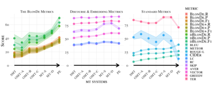 翻译:标准自动衡量标准,如BLEU,对于文件一级的MT评估来说是不可靠的,它们既不能区分翻译质量的文件水平改进与判决水平的改善,也不能辨别导致背景不可知翻译的谈话现象。本文介绍了一个新的自动衡量标准Blonde,以扩大自动MT评价的范围,从判决到文件水平。Blonde通过对讨论的跨度进行分类和计算分类的基于相似的F1尺度来考虑讨论的一致性。我们对新建的数据集BWB进行广泛的比较。实验结果显示,Blonde在文件水平上具有更好的选择性和可解释性,而且对文件水平的细微之处更为敏感。在一项大规模的人类研究中,Blonde还实现了与人类判断比以往的尺度要高得多的皮尔逊与人类判断的相关性。