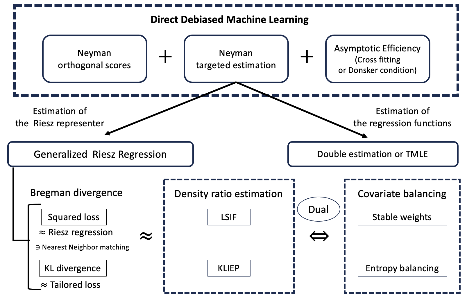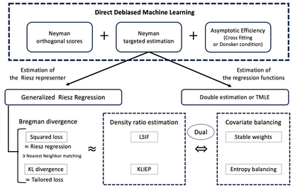 We develop a direct debiased machine learning framework comprising Neyman targeted estimation and generalized Riesz regression. Our framework unifies Riesz regression for automatic debiased machine learning, covariate balancing, targeted maximum likelihood estimation (TMLE), and density-ratio estimation. In many problems involving causal effects or structural models, the parameters of interest depend on regression functions. Plugging regression functions estimated by machine learning methods into the identifying equations can yield poor performance because of first-stage bias. To reduce such bias, debiased machine learning employs Neyman orthogonal estimating equations. Debiased machine learning typically requires estimation of the Riesz representer and the regression function. For this problem, we develop a direct debiased machine learning framework with an end-to-end algorithm. We formulate estimation of the nuisance parameters, the regression function and the Riesz representer, as minimizing the discrepancy between Neyman orthogonal scores computed with known and unknown nuisance parameters, which we refer to as Neyman targeted estimation. Neyman targeted estimation includes Riesz representer estimation, and we measure discrepancies using the Bregman divergence. The Bregman divergence encompasses various loss functions as special cases, where the squared loss yields Riesz regression and the Kullback-Leibler divergence yields entropy balancing. We refer to this Riesz representer estimation as generalized Riesz regression. Neyman targeted estimation also yields TMLE as a special case for regression function estimation. Furthermore, for specific pairs of models and Riesz representer estimation methods, we can automatically obtain the covariate balancing property without explicitly solving the covariate balancing objective.