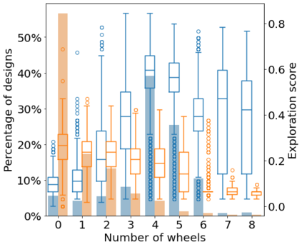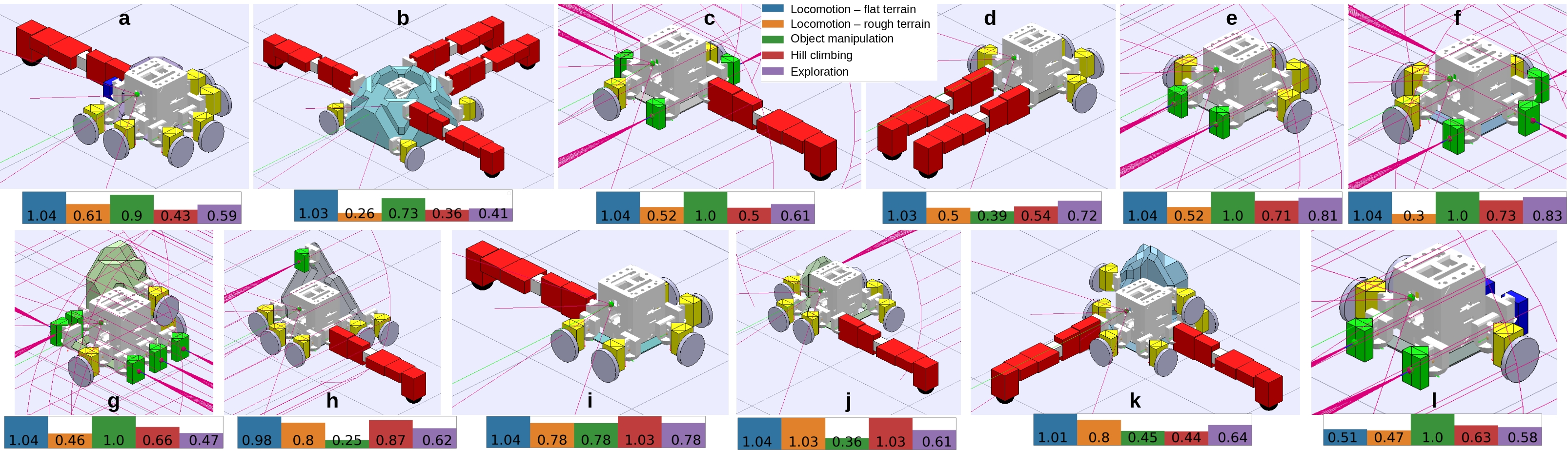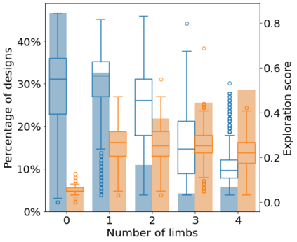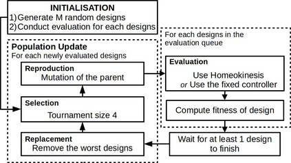 Methods for generative design of robot physical configurations can automatically find optimal and innovative solutions for challenging tasks in complex environments. The vast search-space includes the physical design-space and the controller parameter-space, making it a challenging problem in machine learning and optimisation in general. Evolutionary algorithms (EAs) have shown promising results in generating robot designs via gradient-free optimisation. Morpho-evolution with learning (MEL) uses EAs to concurrently generate robot designs and learn the optimal parameters of the controllers. Two main issues prevent MEL from scaling to higher complexity tasks: computational cost and premature convergence to sub-optimal designs. To address these issues, we propose combining morpho-evolution with intrinsic motivations. Intrinsically motivated behaviour arises from embodiment and simple learning rules without external guidance. We use a homeokinetic controller that generates exploratory behaviour in a few seconds with reduced knowledge of the robot's design. Homeokinesis replaces costly learning phases, reducing computational time and favouring diversity, preventing premature convergence. We compare our approach with current MEL methods in several downstream tasks. The generated designs score higher in all the tasks, are more diverse, and are quickly generated compared to morpho-evolution with static parameters.