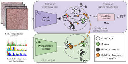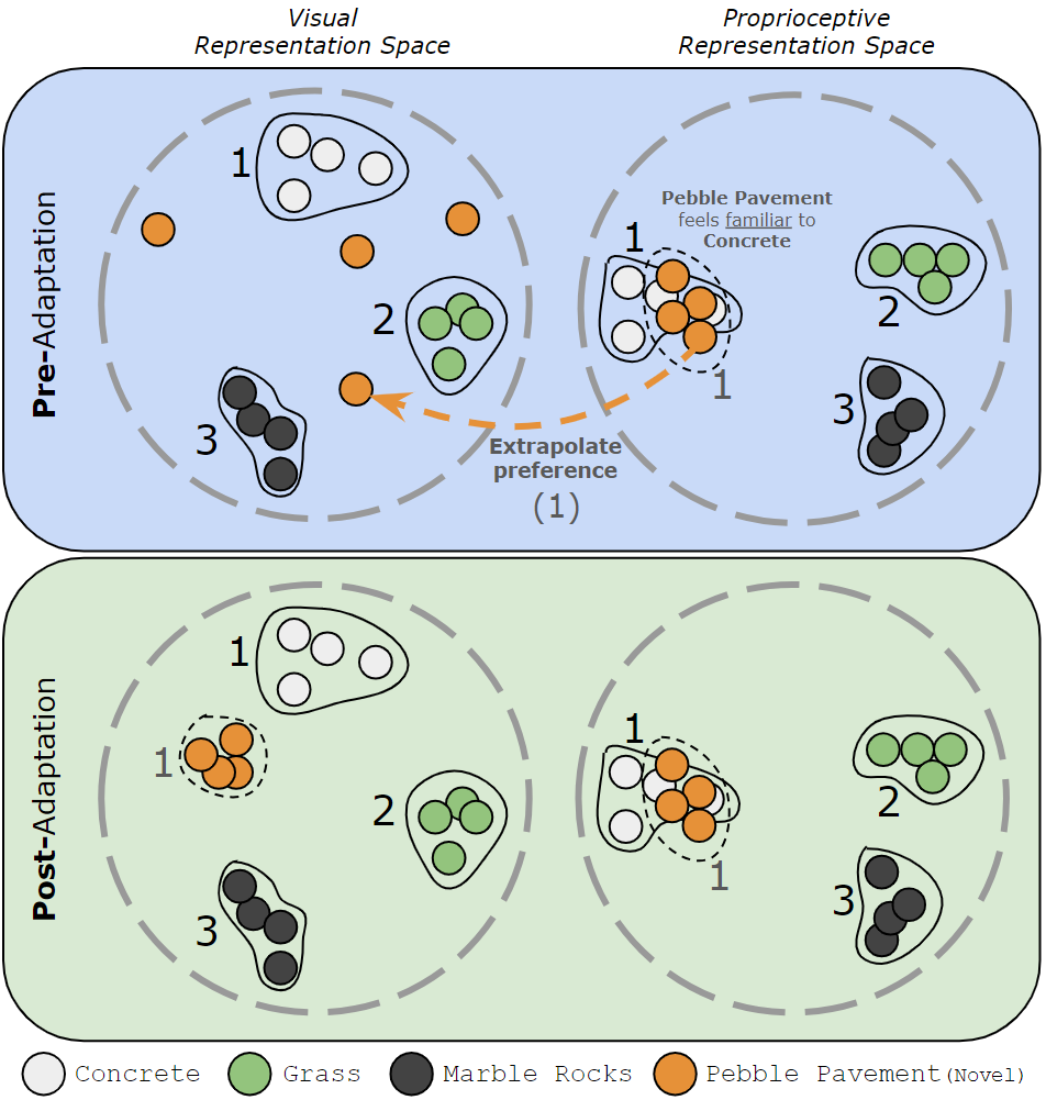 Autonomous mobility tasks such as lastmile delivery require reasoning about operator indicated preferences over terrains on which the robot should navigate to ensure both robot safety and mission success. However, coping with out of distribution data from novel terrains or appearance changes due to lighting variations remains a fundamental problem in visual terrain adaptive navigation. Existing solutions either require labor intensive manual data recollection and labeling or use handcoded reward functions that may not align with operator preferences. In this work, we posit that operator preferences for visually novel terrains, which the robot should adhere to, can often be extrapolated from established terrain references within the inertial, proprioceptive, and tactile domain. Leveraging this insight, we introduce Preference extrApolation for Terrain awarE Robot Navigation, PATERN, a novel framework for extrapolating operator terrain preferences for visual navigation. PATERN learns to map inertial, proprioceptive, tactile measurements from the robots observations to a representation space and performs nearest neighbor search in this space to estimate operator preferences over novel terrains. Through physical robot experiments in outdoor environments, we assess PATERNs capability to extrapolate preferences and generalize to novel terrains and challenging lighting conditions. Compared to baseline approaches, our findings indicate that PATERN robustly generalizes to diverse terrains and varied lighting conditions, while navigating in a preference aligned manner.