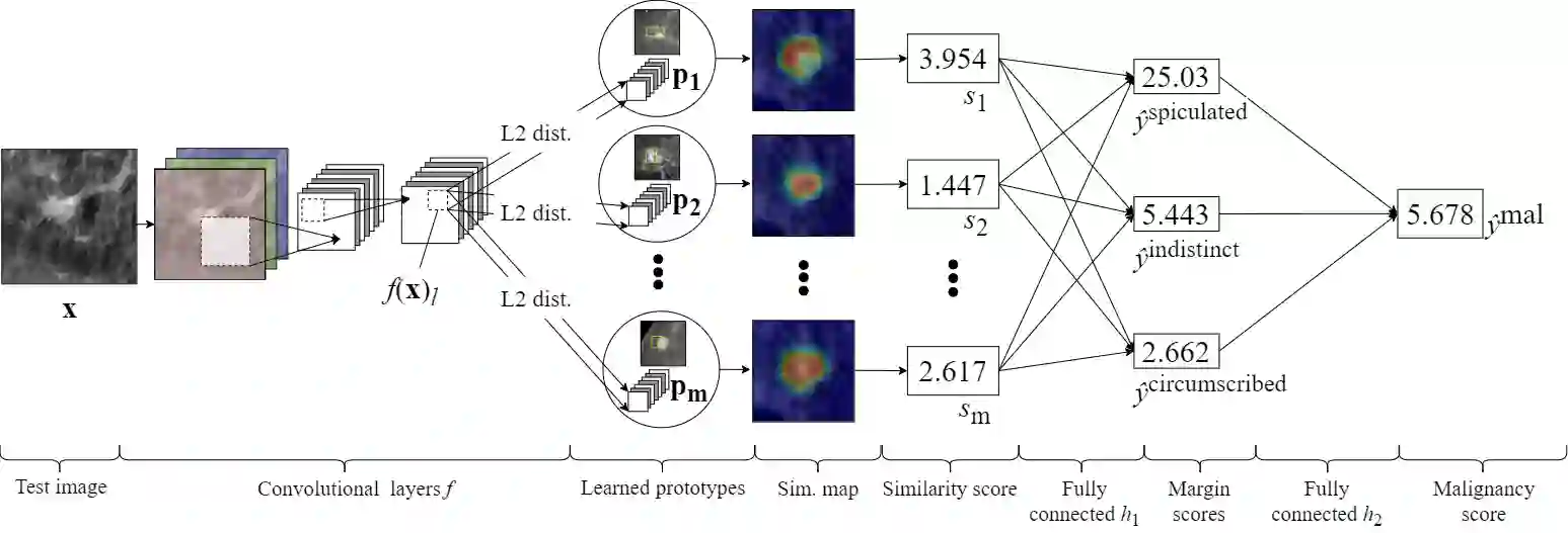 翻译:当我们在高取量医学环境中部署机器学习模型时,我们必须确保这些模型作出与已知医学科学相一致的准确预测。内在的解释性网络通过解释每项决定背后的理由来应对这一需要,同时保持与黑箱模型相同或更高的精确度。在这项工作中,我们提出了一个新型的可解释神经网络算法,使用基于案例的推理进行乳房造影。设计我们的网络是为了帮助放射学家做出决策,我们的网络既能预测恶性,又能以已知医学特征解释这种预测。为了提供有益的解释,这个网络旨在模仿放射学家的推理过程:我们的网络首先通过比较每张新图像的临床相关语义特征,将每张新图像与一组从培训图像中学习的原型图像部分进行比较,然后使用这些临床特征来预测恶性。与其他方法相比,我们的模型以同等或更高的精确度检测临床特征(质量边距),对它的预测提供更详细的解释,并且能够更准确地区分图像的分类相关部分。