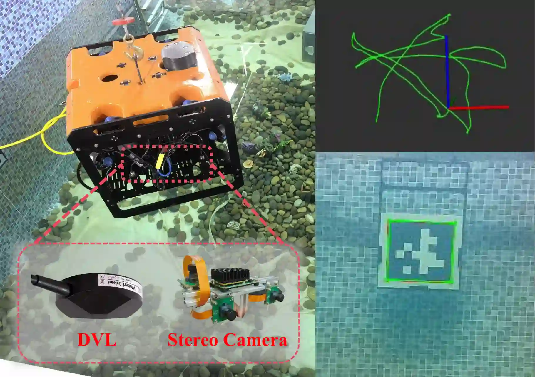 翻译:在水下同步定位与建图(SLAM)系统中,为实现高精度性能所需传感器间外部参数与时钟偏移的标定问题尚未得到充分研究。现有针对多普勒速度计程仪(DVL)的标定方法或受限于特定传感器配置,或依赖过度简化的假设,且均未实现平移外部参数与时间偏移的联合估计。本文提出一种适用于通用DVL传感器配置的统一迭代标定(UIC)框架,该框架以最大后验概率(MAP)估计形式构建,并引入高斯过程(GP)运动先验以实现高保真运动插值。UIC通过高效的高斯过程运动状态更新与基于梯度的标定变量更新交替进行,并辅以经证明具有统计一致性的序列初始化方案。所提出的UIC方法可扩展应用于惯性测量单元(IMU)、相机及其他模态的协同传感器标定。我们同时开源了一套DVL-相机标定工具箱。除水下应用外,UIC的多个核心特性——例如基于MAP标定的高斯过程先验融合方法,以及可证明具有可靠性的初始化流程设计——对其他多传感器标定问题具有广泛适用性。最后,通过仿真与真实场景实验验证了本方法的有效性。