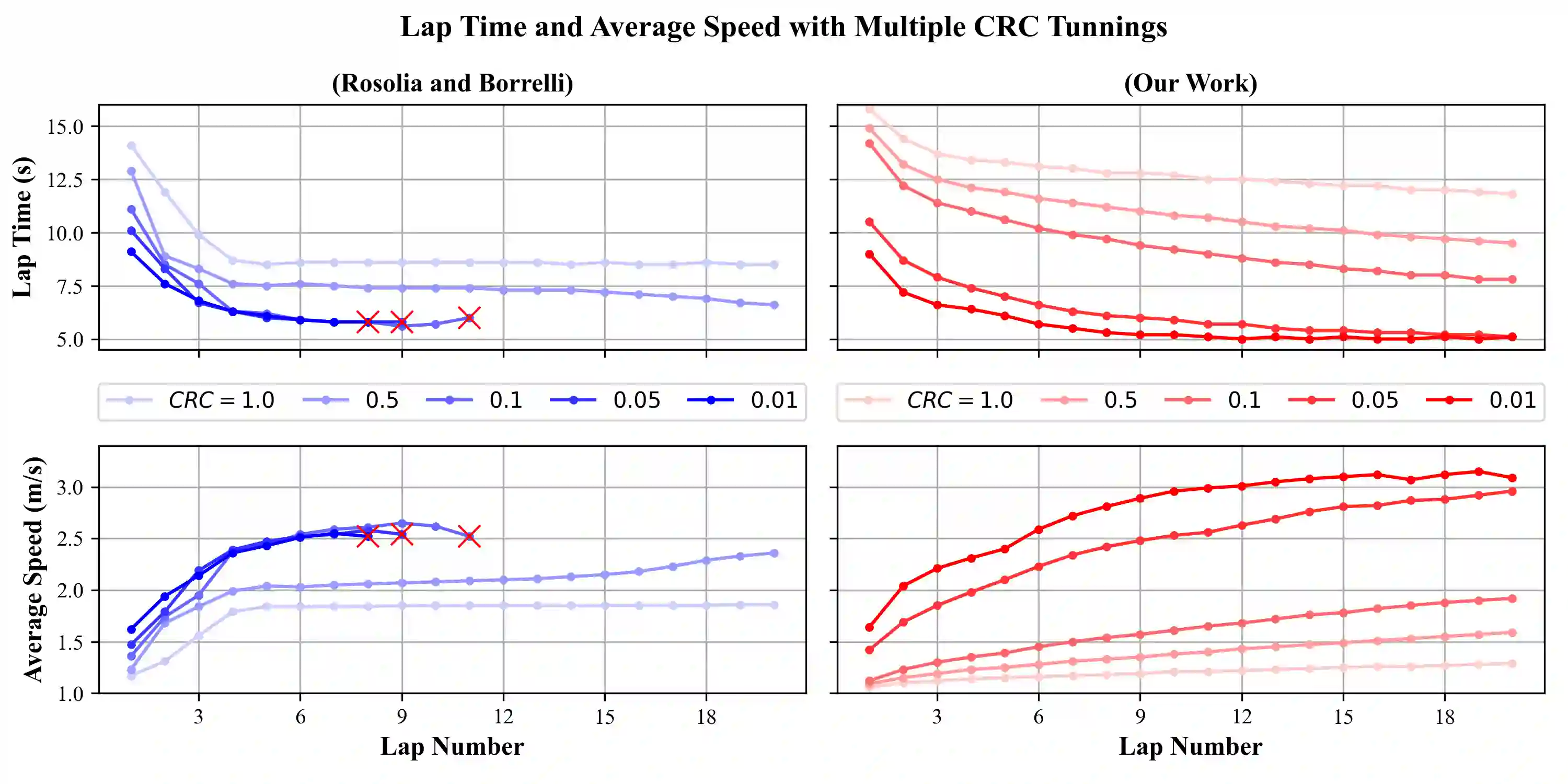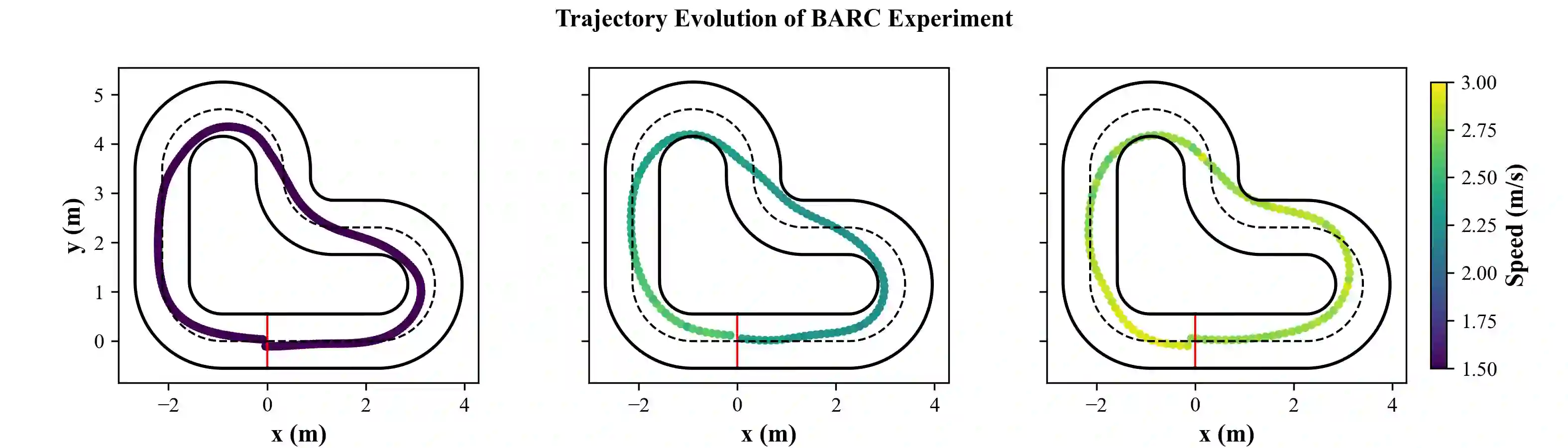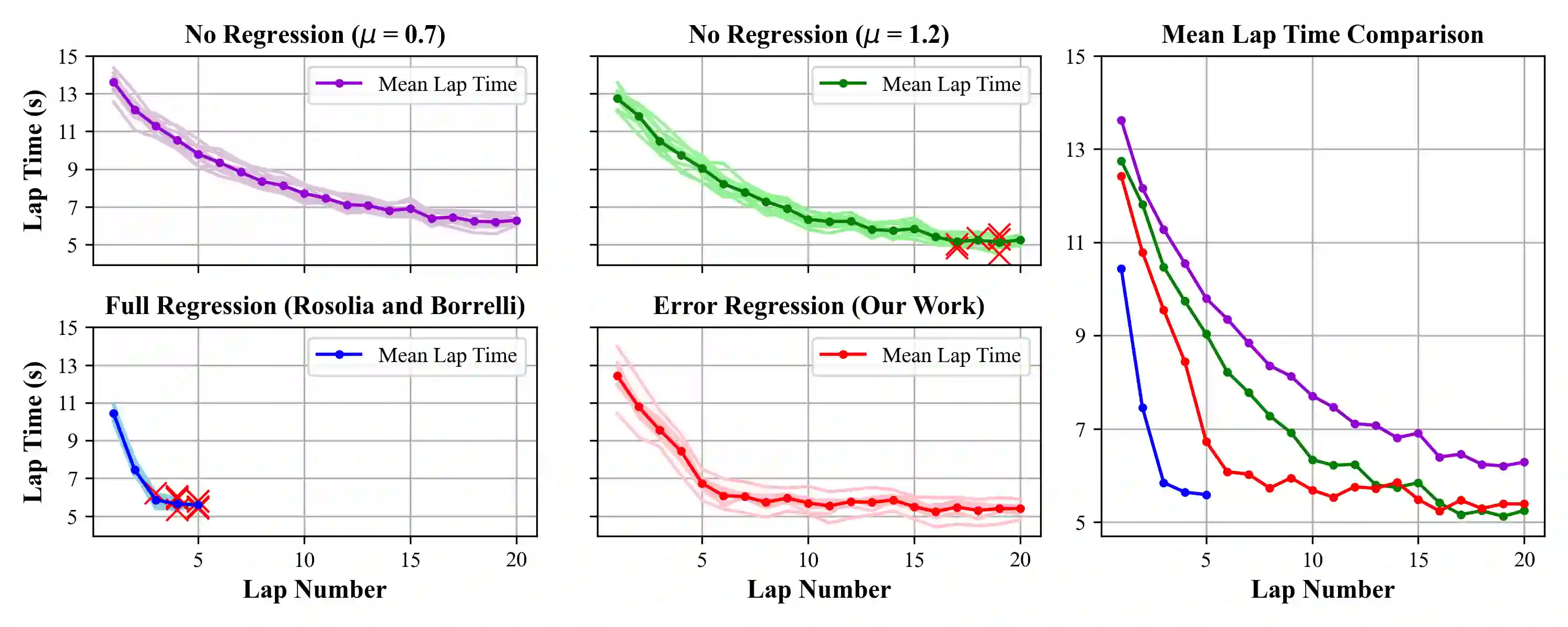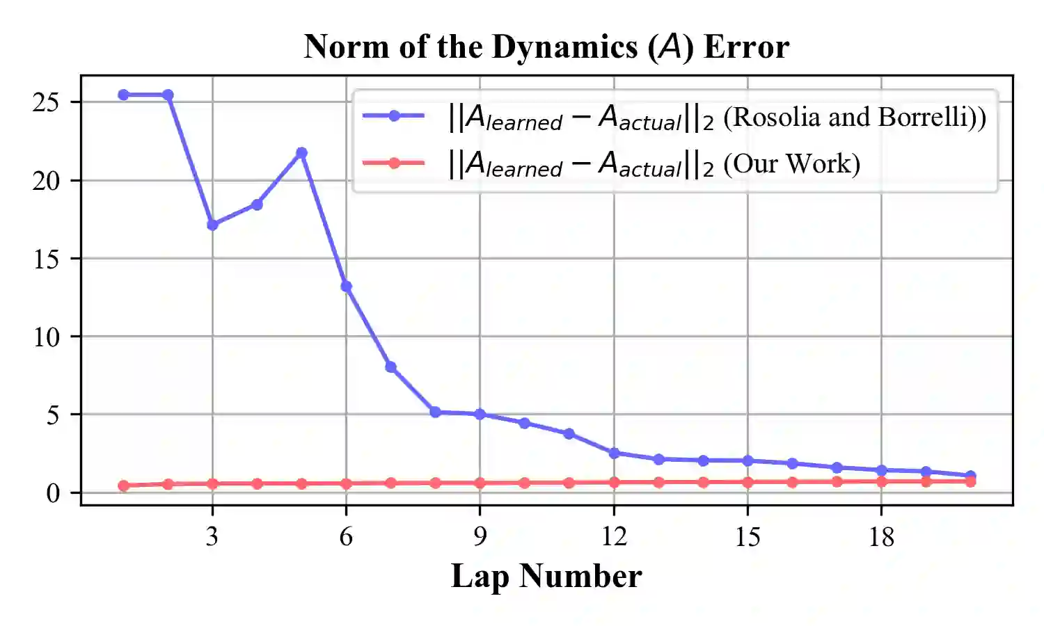 This work presents a novel Learning Model Predictive Control (LMPC) strategy for autonomous racing at the handling limit that can iteratively explore and learn unknown dynamics in high-speed operational domains. We start from existing LMPC formulations and modify the system dynamics learning method. In particular, our approach uses a nominal, global, nonlinear, physics-based model with a local, linear, data-driven learning of the error dynamics. We conduct experiments in simulation, 1/10th scale hardware, and deployed the proposed LMPC on a full-scale autonomous race car used in the Indy Autonomous Challenge (IAC) with closed loop experiments at the Putnam Park Road Course in Indiana, USA. The results show that the proposed control policy exhibits improved robustness to parameter tuning and data scarcity. Incremental and safety-aware exploration toward the limit of handling and iterative learning of the vehicle dynamics in high-speed domains is observed both in simulations and experiments.