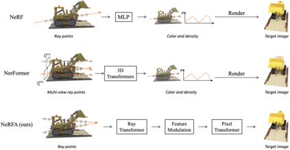 翻译:在本文中, 我们展示了一个简单的后继2seq 配方, 用于查看合成。 我们将一组射线点作为与射线相对应的输入和输出颜色。 直接将一个标准变压器用于此后继2seq 配方有两个限制。 首先, 标准关注无法成功地适应体积转换程序, 因此在综合观点中缺少高频组件。 其次, 对所有射线和像素应用全球关注极为低效。 在神经光亮场的启发下, 我们建议 NERFA 关注( NERFA ) 解决上述问题。 一方面, NERFA 将体积转换方程式视为软功能调制程序。 这样, 功能调制能增强变压器, 与NERFS一样的演算偏差。 另一方面, NERFA 将多阶段关注减少计算管理。 此外, NERFA 模型采用射线和像变压器来学习射线和像素之间的相互作用。 NERFA 将展示优优于NRF和 NerferF3 的图像, 在四种公开的版本中, 设置下, 。 将建立一个新的 Creal- Forformax- 。 。 。 在四个 设置下, 建立新的 建立新的 Cal- gold- gold- 。