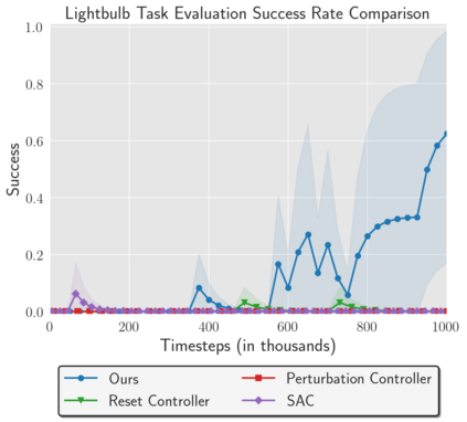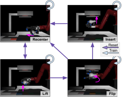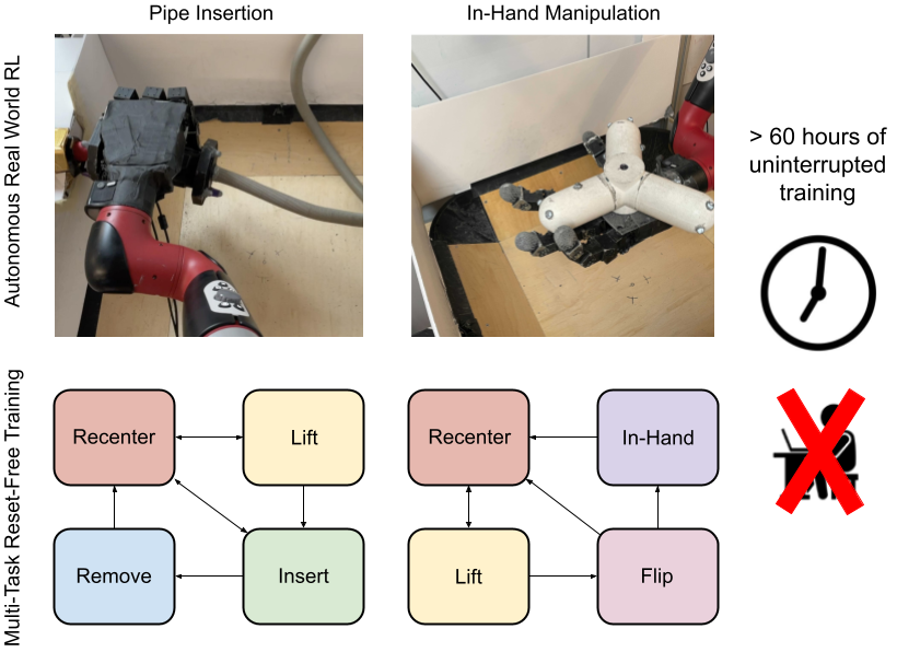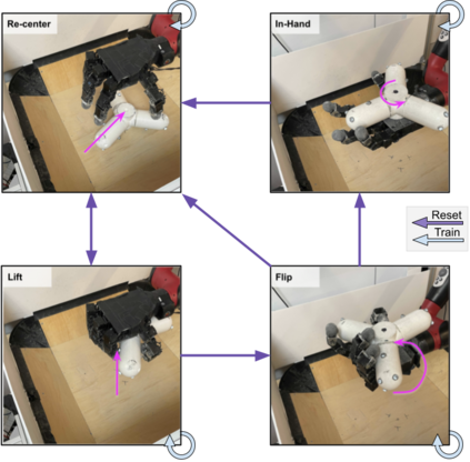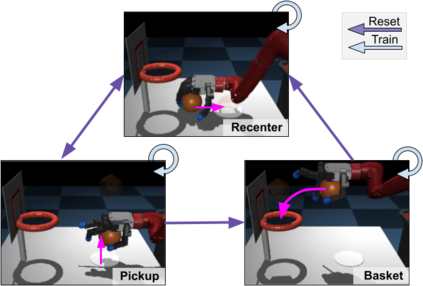 翻译:原则上,强化学习(RL)算法可以通过从通过试验和错误收集的真实世界的大量数据中学习,获得复杂的机器人技能。然而,大多数RL算法都使用精心设计的设置来收集数据,需要人的监督和干预来提供后遗症。这在挑战机器人的问题中特别明显,例如dexterous 操纵。为了使数据收集能够缩放,这些应用需要重新设置的算法,这种算法能够自主地学习,而没有明确的仪器或人类干预。这个领域的大多数先前工作处理的是单任务学习。然而,我们也许也想要能够进行大量技能重组的机器人。首先,这似乎只会使问题变得更为棘手。然而,我们在这项工作中的主要观察是,一个选择得当的多任务设置的多任务设置实际上减轻了重置的学习挑战,而不需要什么额外的机械。事实上,解决多任务处理的任何重置的问题可以直接解决任何重置的问题,因为不同的任务组合可以用来完成其他任务的重置。通过学习多种任务,我们可以有效地学习多任务来重新学习,这样可以有效地学习多任务,从而重新学习更多的重修。
