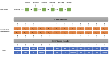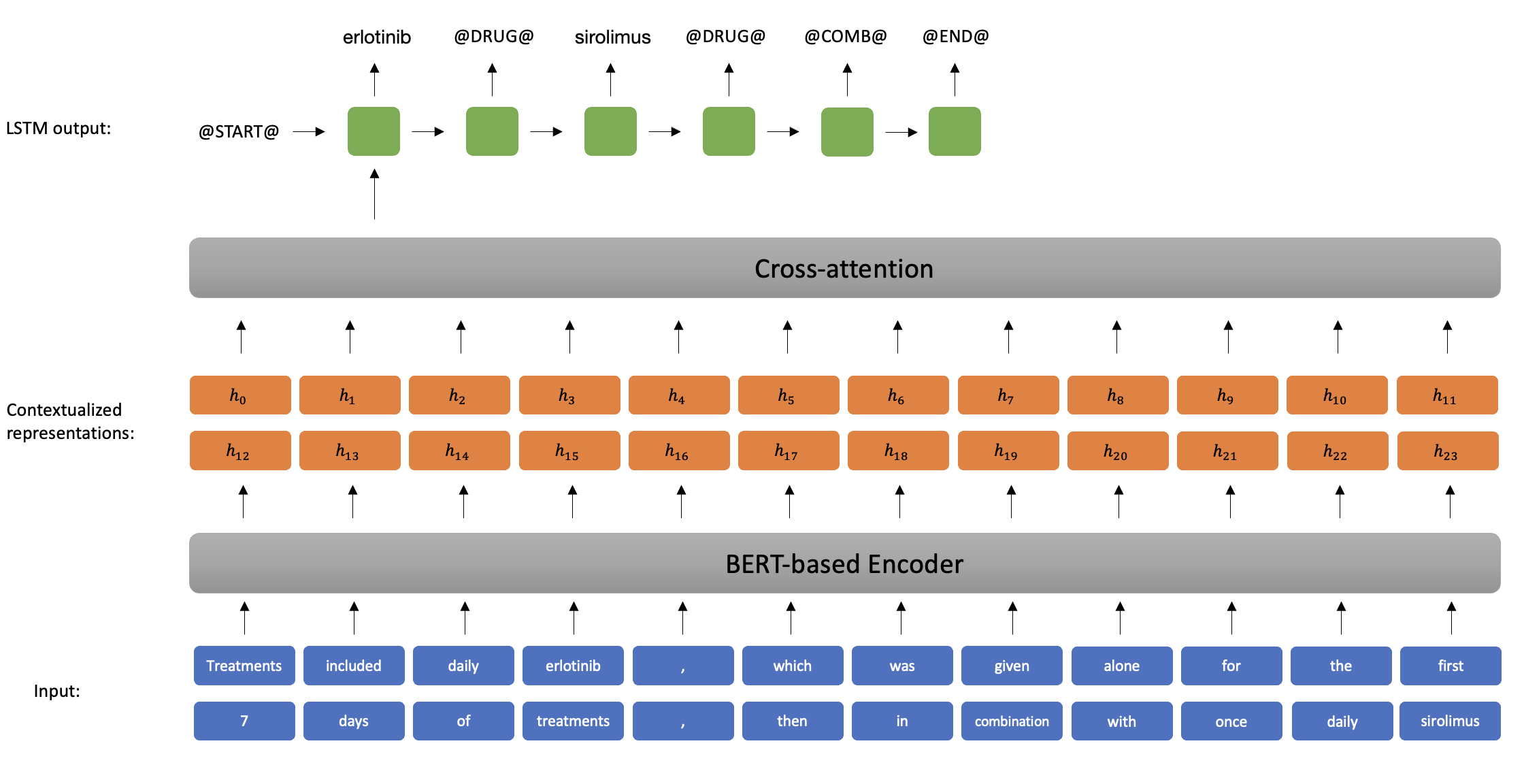 翻译:组合药物疗法是涉及两种或两种以上药物的治疗方案,常用于癌症、艾滋病、疟疾或结核病等患者的治疗。目前,PubMed 中至少有 35 万篇文章使用了“组合药物疗法” MeSH heading,过去二十年每年至少有 1 万篇文章被发表。从科学文献中提取组合疗法本质上构成了一个 $n$ 元关系抽取问题。与普通的 $n$ 元关系不同,其中 $n$ 是固定的(例如,$n=3$ 的药物-基因-突变关系),提取组合疗法是一个特殊的设置,其中 $n\ge2$ 是动态的,取决于每个实例。近期,Tiktinsky et al.(NAACL 2022)推出了第一个数据集 CombDrugExt,用于从文献中提取这种疗法。在此基础上,我们使用序列到序列风格的端到端抽取方法,在 CombDrugExt 测试集上实现了 $66.7\%$ 的 F1 值,标志着本文端到端抽取模型是首个最新的,已优于此前最佳非端到端模型的态度。我们的模型可以无缝抽取所有药物实体和关系,并非常适合动态的 $n$ 元抽取场景。