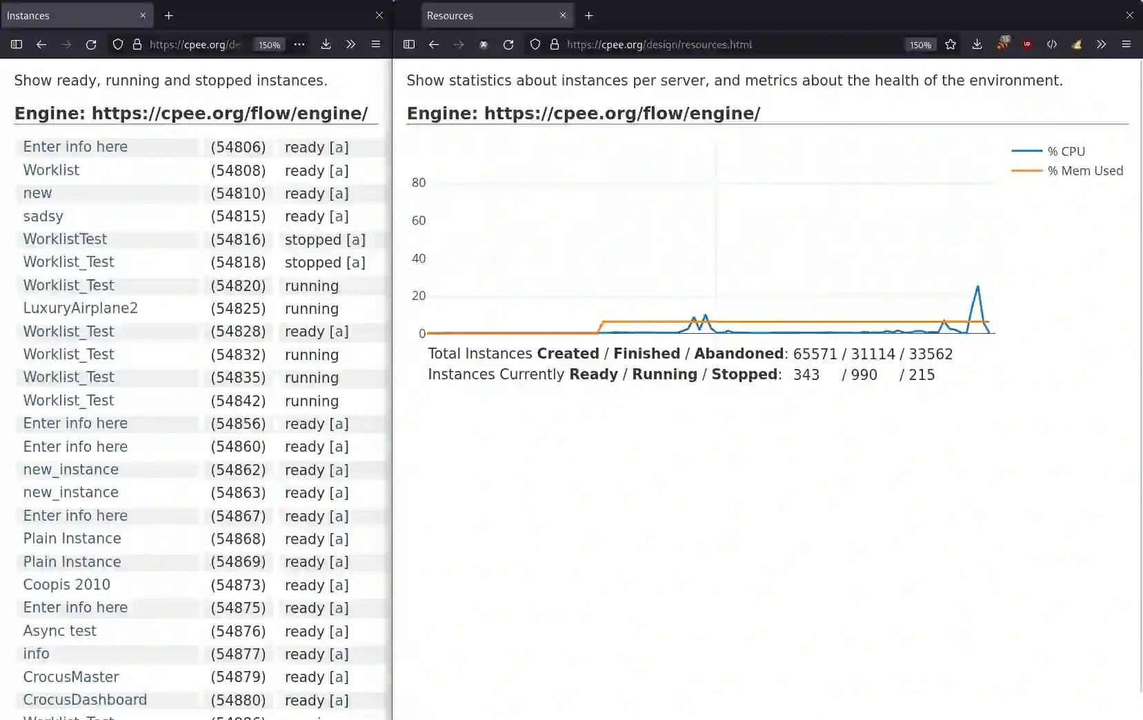 Process Execution Engines are a vital part of Business Process Management (BPM) and Manufacturing Orchestration Management (MOM), as they allow the business or manufacturing logic (expressed in a graphical notation such as BPMN) to be executed. This execution drives and supervises all interactions between humans, machines, software, and the environment. If done right, this will lead to a highly flexible, low-code, and easy to maintain solution, that allows for ad-hoc changes and functional evolution, as well as delivering a wealth of data for data-science applications. The Cloud Process Execution Engine CPEE.org implements a radically distributed scale-out architecture, together with a minimal set of interfaces, to allow for the simplest possible integration with existing services, machines, and existing data-analysis tools. Its open-source components can serve as a blueprint for future development of commercial solutions, and serves as a proven testbed for academic research, teaching, and industrial application since 2008. In this paper we present the architecture, interfaces that make CPEE.org possible, as well as discuss different lifecycle models utilized during execution to provide overarching support for a wide range of data-analysis tasks.