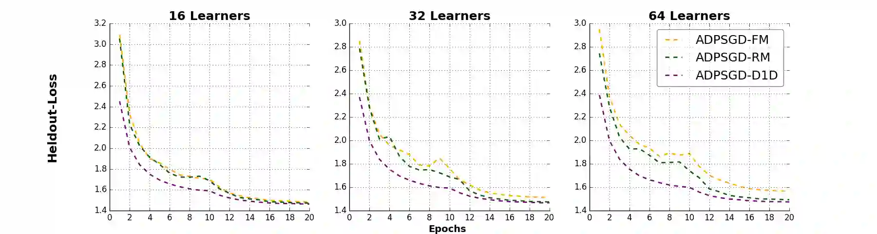 翻译:对深声模型的大规模分布式培训在当今高性能自动语音识别(ASR)中发挥了重要作用。在本文件中,我们根据平行随机梯度梯度下降的数据,调查各种分散分散式培训战略,以显示其优于通过冲积(尤其是处理大批量)进行常用同步分布式培训的优异性,特别是在处理大批量时。我们研究了三种非同步分散式平行SGD(ADPSGD)的变异性,即固定和随机化的环形自动语音识别模式以及一个延迟计划。我们采用了ADPSGD的数学模型,提供其理论趋同率,并比较三个变异体的经验趋同行为和累赘弹性弹性性。实验是在IBM超级计算机上进行的,用于培训深度短时间存储(LSTM)的声学模型。在各种培训配置下,对拟议战略的承认和加速性表现进行了评估。我们发现,ADPSGDD和随机化通信模式与缓慢的学习者相匹配。当学习者使用最迅速的GPSDGD战略时,使用最慢的压速度速度可以与最慢的压。