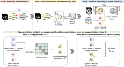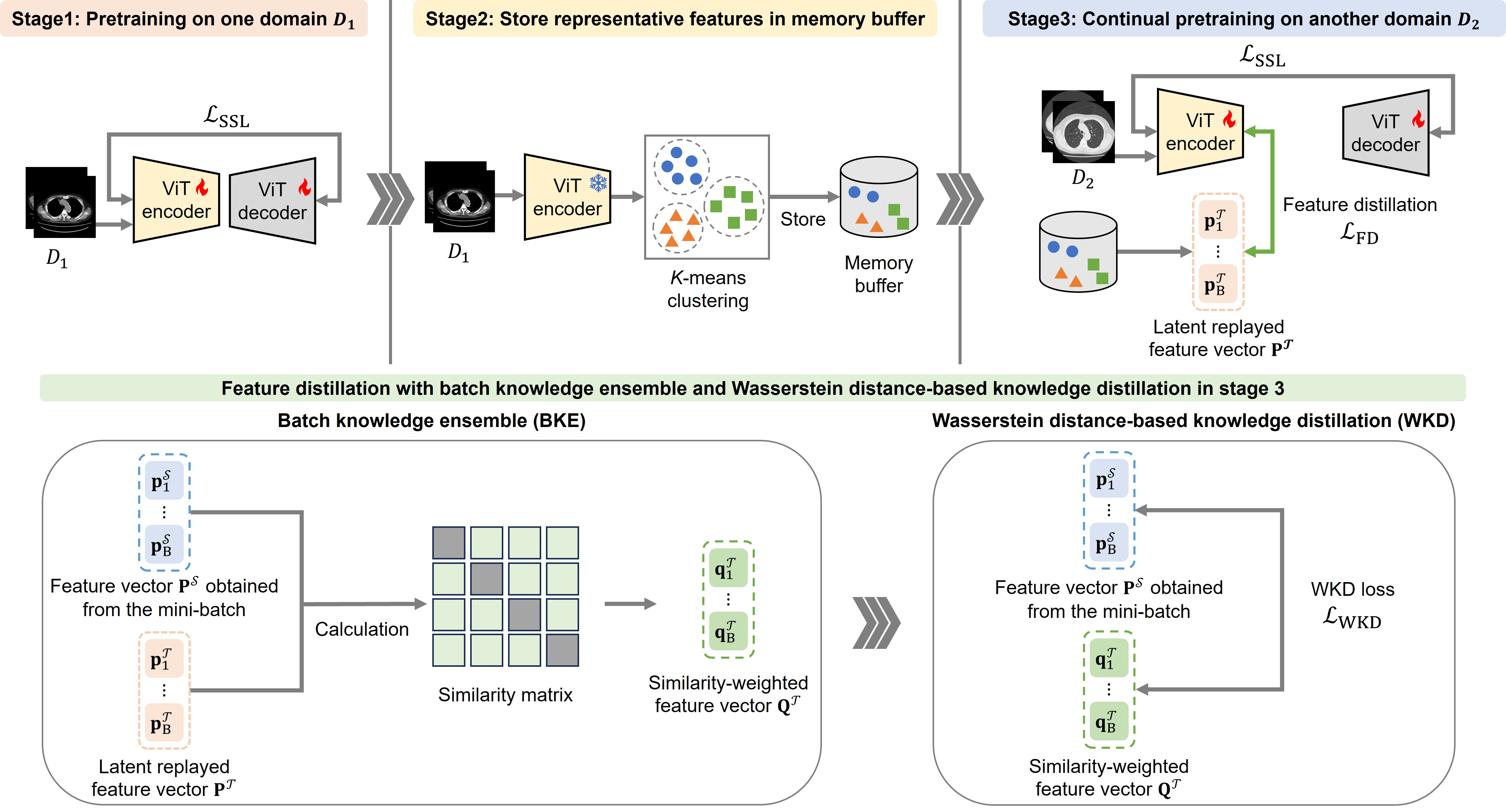 We propose a novel continual self-supervised learning (CSSL) framework for simultaneously learning diverse features from multi-window-obtained chest computed tomography (CT) images and ensuring data privacy. Achieving a robust and highly generalizable model in medical image diagnosis is challenging, mainly because of issues, such as the scarcity of large-scale, accurately annotated datasets and domain shifts inherent to dynamic healthcare environments. Specifically, in chest CT, these domain shifts often arise from differences in window settings, which are optimized for distinct clinical purposes. Previous CSSL frameworks often mitigated domain shift by reusing past data, a typically impractical approach owing to privacy constraints. Our approach addresses these challenges by effectively capturing the relationship between previously learned knowledge and new information across different training stages through continual pretraining on unlabeled images. Specifically, by incorporating a latent replay-based mechanism into CSSL, our method mitigates catastrophic forgetting due to domain shifts during continual pretraining while ensuring data privacy. Additionally, we introduce a feature distillation technique that integrates Wasserstein distance-based knowledge distillation (WKD) and batch-knowledge ensemble (BKE), enhancing the ability of the model to learn meaningful, domain-shift-robust representations. Finally, we validate our approach using chest CT images obtained across two different window settings, demonstrating superior performance compared with other approaches.