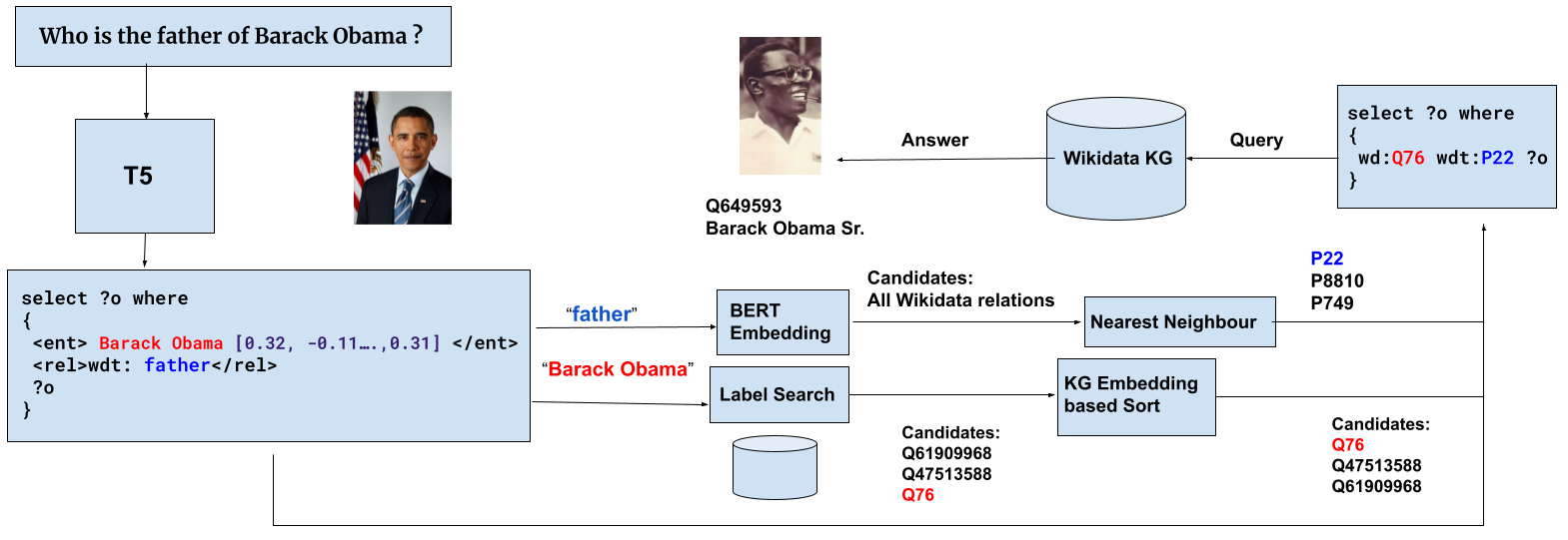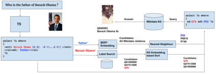 在本文中,我们提出了一种名为GETT-QA的端到端知识图问答系统。GETT-QA使用T5,一种流行的文本到文本预训练语言模型。该模型以自然语言的形式接受问题作为输入,并生成简化形式的预期SPARQL查询。在简化形式中,该模型不直接生成实体和关系ID,而是生成相应的实体和关系标签。标签在随后的步骤中与KG实体和关系ID相结合。为了进一步改善结果,我们指导该模型生成每个实体的KG嵌入的截断版本。截断KG嵌入使细化搜索用于消歧。我们发现,T5能够在不改变损失函数的情况下学习截断的KG嵌入,从而提高了KGQA的性能。因此,我们在Wikidata的LC-QuAD 2.0和SimpleQuestions-Wikidata数据集上报告了端到端KGQA的强大结果。