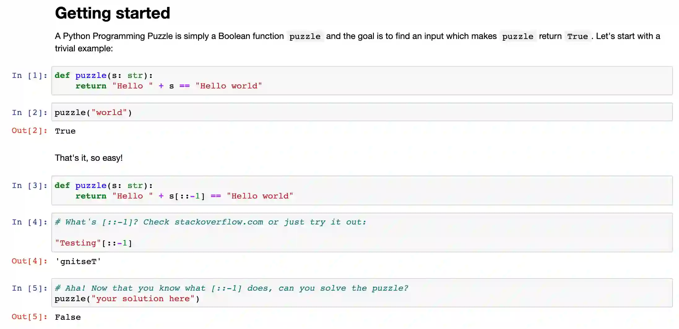 We introduce a new type of programming challenge called programming puzzles, as an objective and comprehensive evaluation of program synthesis, and release an open-source dataset of Python Programming Puzzles (P3). Each puzzle is defined by a short Python program $f$, and the goal is to find an input $x$ which makes $f$ output "True". The puzzles are objective in that each one is specified entirely by the source code of its verifier $f$, so evaluating $f(x)$ is all that is needed to test a candidate solution $x$. They do not require an answer key or input/output examples, nor do they depend on natural language understanding. The dataset is comprehensive in that it spans problems of a range of difficulties and domains, ranging from trivial string manipulation problems that are immediately obvious to human programmers (but not necessarily to AI), to classic programming puzzles (e.g., Towers of Hanoi), to interview/competitive-programming problems (e.g., dynamic programming), to longstanding open problems in algorithms and mathematics (e.g., factoring). The objective nature of P3 readily supports self-supervised bootstrapping. We develop baseline enumerative program synthesis and GPT-3 solvers that are capable of solving easy puzzles -- even without access to any reference solutions -- by learning from their own past solutions. Based on a small user study, we find puzzle difficulty to correlate between human programmers and the baseline AI solvers.