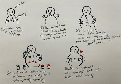 There is growing interest in designing playful interactions with food, but food based tangible interactive narratives have received less attention. We introduce Gummy's Way Out, an interactive tangible narrative experience where interactors eat a gummy bear and help him find his way out of their bodies by eating various food items. By consuming different things, the interactor either helps or hinders the gummy bear's journey through an imagined Diegetic body that overlaps with their own. Interactors are endowed with the gummy bear's well-being and are also encouraged to reflect on how their actions can impact their Lived body. We present preliminary results of a user study and design considerations on how to design for the diegetic body in interactive food based narrative experiences. We recommend leveraging the sensory and emotional properties of food to create a visceral narrative experience.