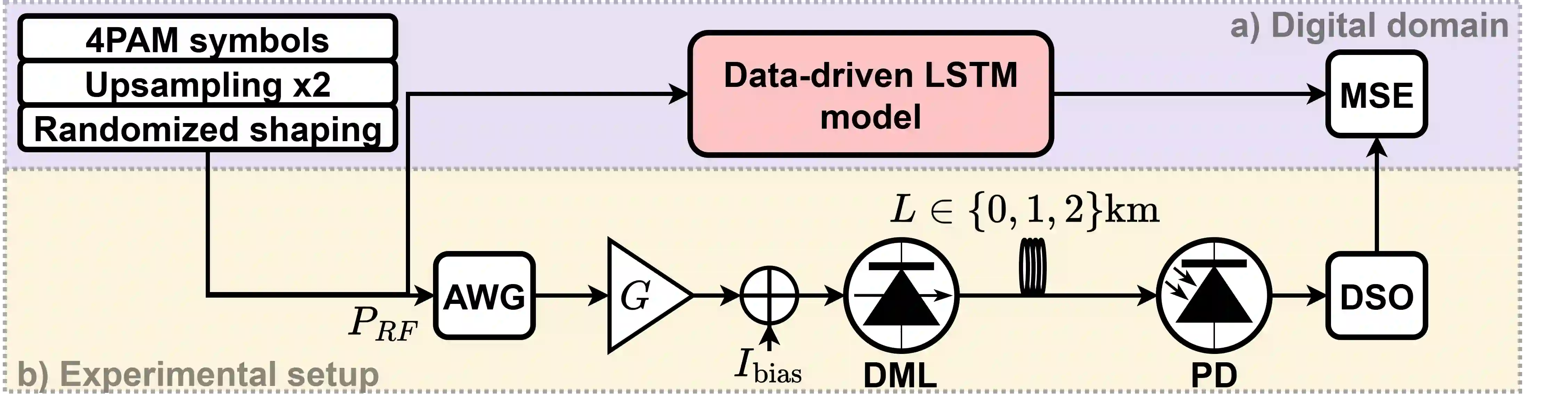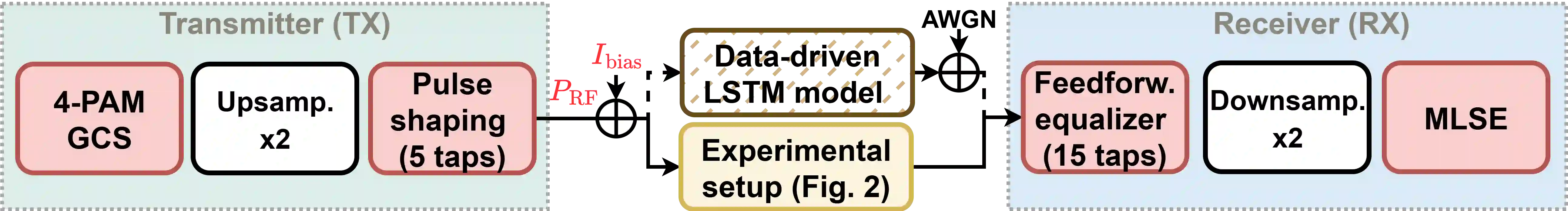 翻译:直接调制激光器(DML)是短距离强度调制与直接检测通信系统中一项极具吸引力的技术。然而,其复杂的非线性动力学特性使得基于DML的系统建模与优化面临挑战。本文基于实验数据训练的数据驱动代理模型,研究了基于DML系统的端到端优化。该端到端优化涵盖了脉冲成形与均衡器滤波器、激光器的偏置电流以及施加的调制射频(RF)功率。我们在实验装置上测试了该端到端优化方案的性能,并将其与基于线性和非线性接收端均衡的四种不同基准方案进行了比较。结果表明,所提出的端到端方案能够在所研究的符号速率和传输距离范围内提供更优的性能,同时采用更低的调制RF功率、更少的滤波器抽头并占用更小的信号带宽。