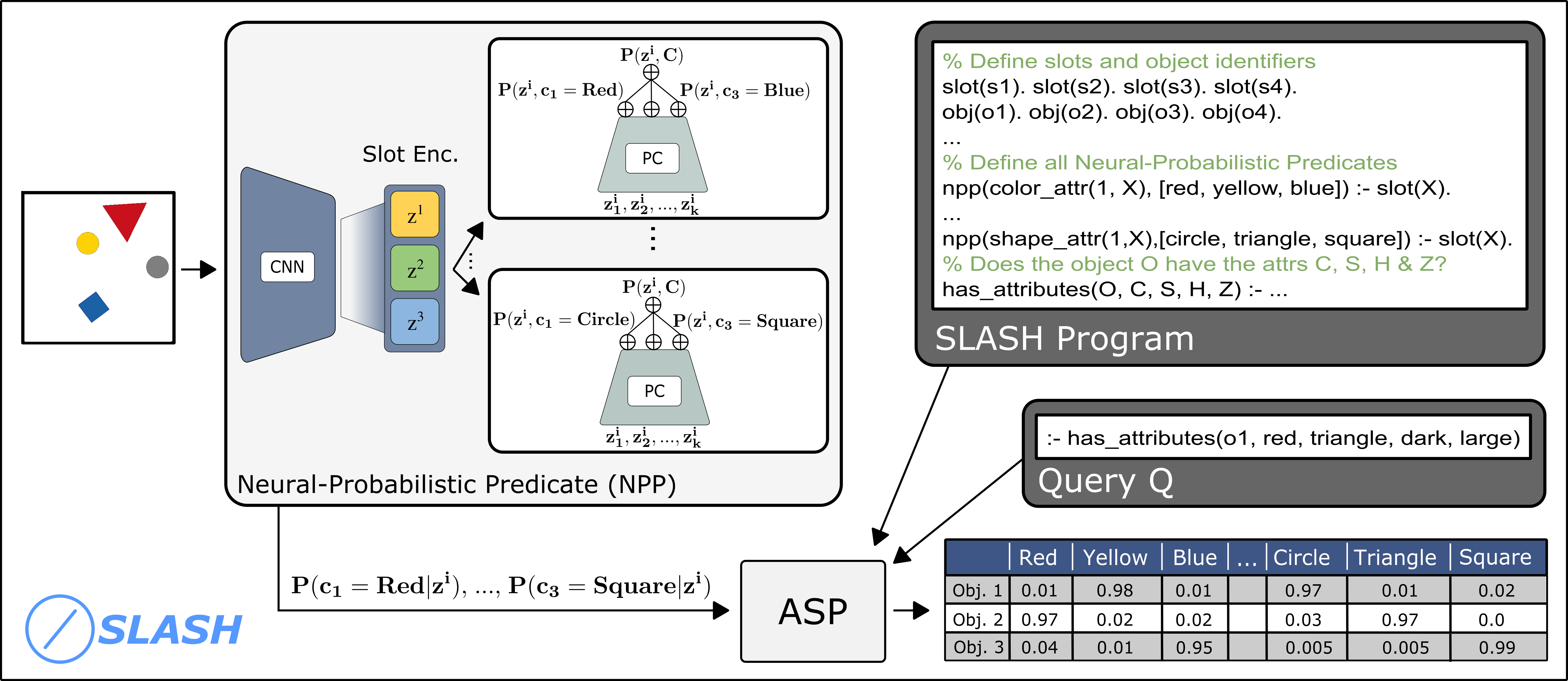 The goal of combining the robustness of neural networks and the expressivity of symbolic methods has rekindled the interest in neuro-symbolic AI. Recent advancements in neuro-symbolic AI often consider specifically-tailored architectures consisting of disjoint neural and symbolic components, and thus do not exhibit desired gains that can be achieved by integrating them into a unifying framework. We introduce SLASH -- a novel deep probabilistic programming language (DPPL). At its core, SLASH consists of Neural-Probabilistic Predicates (NPPs) and logical programs which are united via answer set programming. The probability estimates resulting from NPPs act as the binding element between the logical program and raw input data, thereby allowing SLASH to answer task-dependent logical queries. This allows SLASH to elegantly integrate the symbolic and neural components in a unified framework. We evaluate SLASH on the benchmark data of MNIST addition as well as novel tasks for DPPLs such as missing data prediction and set prediction with state-of-the-art performance, thereby showing the effectiveness and generality of our method.