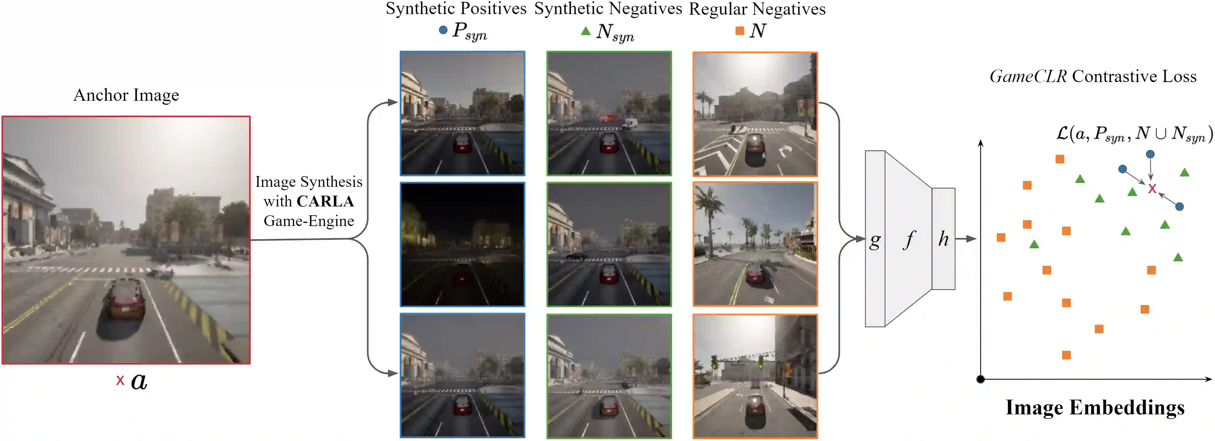 Having access to accurate game state information is of utmost importance for any artificial intelligence task including game-playing, testing, player modeling, and procedural content generation. Self-Supervised Learning (SSL) techniques have shown to be capable of inferring accurate game state information from the high-dimensional pixel input of game footage into compressed latent representations. Contrastive Learning is a popular SSL paradigm where the visual understanding of the game's images comes from contrasting dissimilar and similar game states defined by simple image augmentation methods. In this study, we introduce a new game scene augmentation technique -- named GameCLR -- that takes advantage of the game-engine to define and synthesize specific, highly-controlled renderings of different game states, thereby, boosting contrastive learning performance. We test our GameCLR technique on images of the CARLA driving simulator environment and compare it against the popular SimCLR baseline SSL method. Our results suggest that GameCLR can infer the game's state information from game footage more accurately compared to the baseline. Our proposed approach allows us to conduct game artificial intelligence research by directly utilizing screen pixels as input.