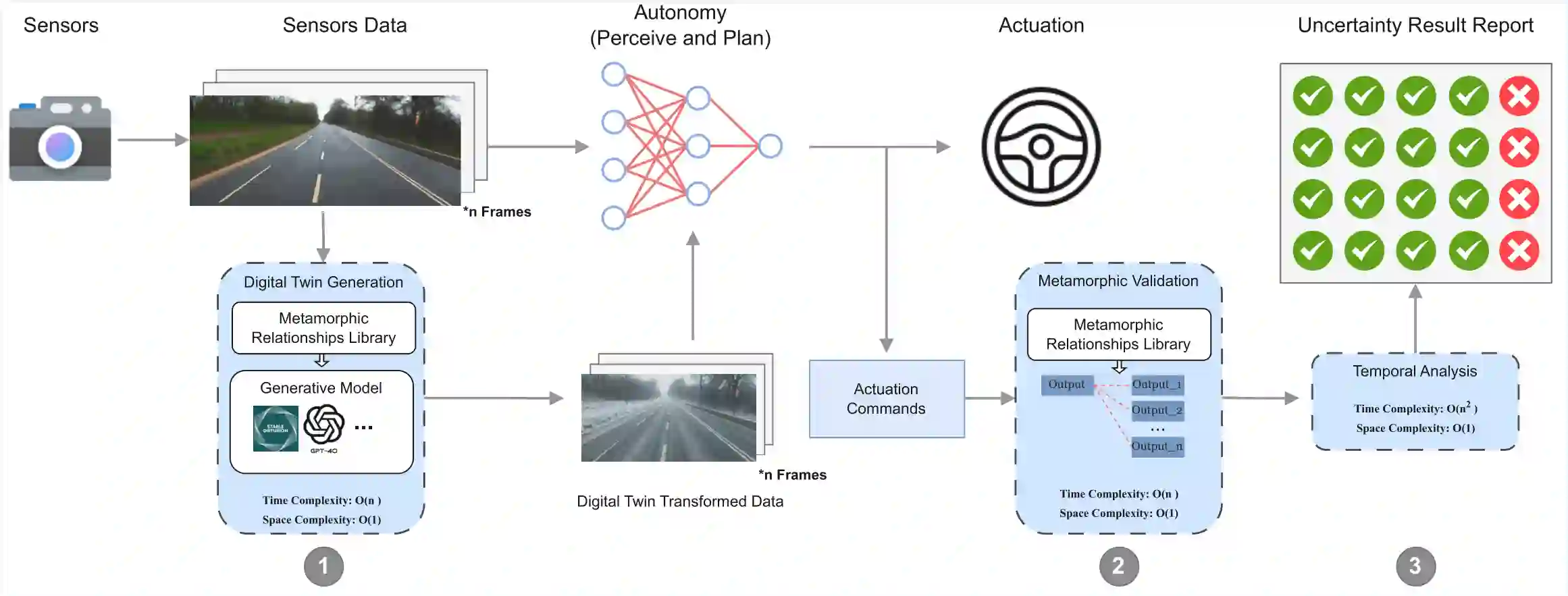 Ensuring the safety of self-driving cars remains a major challenge due to the complexity and unpredictability of real-world driving environments. Traditional testing methods face significant limitations, such as the oracle problem, which makes it difficult to determine whether a system's behavior is correct, and the inability to cover the full range of scenarios an autonomous vehicle may encounter. In this paper, we introduce a digital twin-driven metamorphic testing framework that addresses these challenges by creating a virtual replica of the self-driving system and its operating environment. By combining digital twin technology with AI-based image generative models such as Stable Diffusion, our approach enables the systematic generation of realistic and diverse driving scenes. This includes variations in weather, road topology, and environmental features, all while maintaining the core semantics of the original scenario. The digital twin provides a synchronized simulation environment where changes can be tested in a controlled and repeatable manner. Within this environment, we define three metamorphic relations inspired by real-world traffic rules and vehicle behavior. We validate our framework in the Udacity self-driving simulator and demonstrate that it significantly enhances test coverage and effectiveness. Our method achieves the highest true positive rate (0.719), F1 score (0.689), and precision (0.662) compared to baseline approaches. This paper highlights the value of integrating digital twins with AI-powered scenario generation to create a scalable, automated, and high-fidelity testing solution for autonomous vehicle safety.