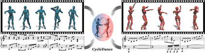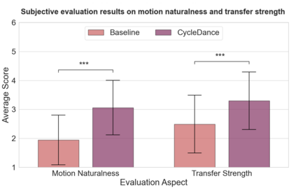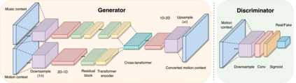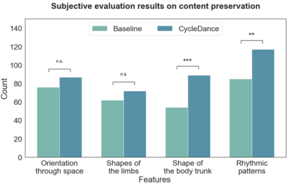 翻译:我们展示了一种舞蹈风格的交接系统,将一种舞蹈风格的现有运动片段转变为另一种舞蹈风格的运动片段,同时试图保存舞蹈的运动背景。我们的方法扩展了一种现有的循环GAN结构,用于制作音频序列模型,并结合了多式变压器编码器,以顾及音乐背景。我们采用了基于序列的课程学习以稳定培训。我们的方法捕捉了运动框架之间的丰富和长期内部关系,这是运动转移和合成工作中的共同挑战。我们进一步引入了在舞蹈运动中衡量转移强度和内容保存的新指标。我们开展了一项广泛的通融研究以及一项人类研究,其中包括30名有5年或5年以上舞蹈经验的参与者。结果显示周期产生符合目标风格的现实运动,在自然特性、转移强度和内容保存方面大大超过基线的循环GAN。