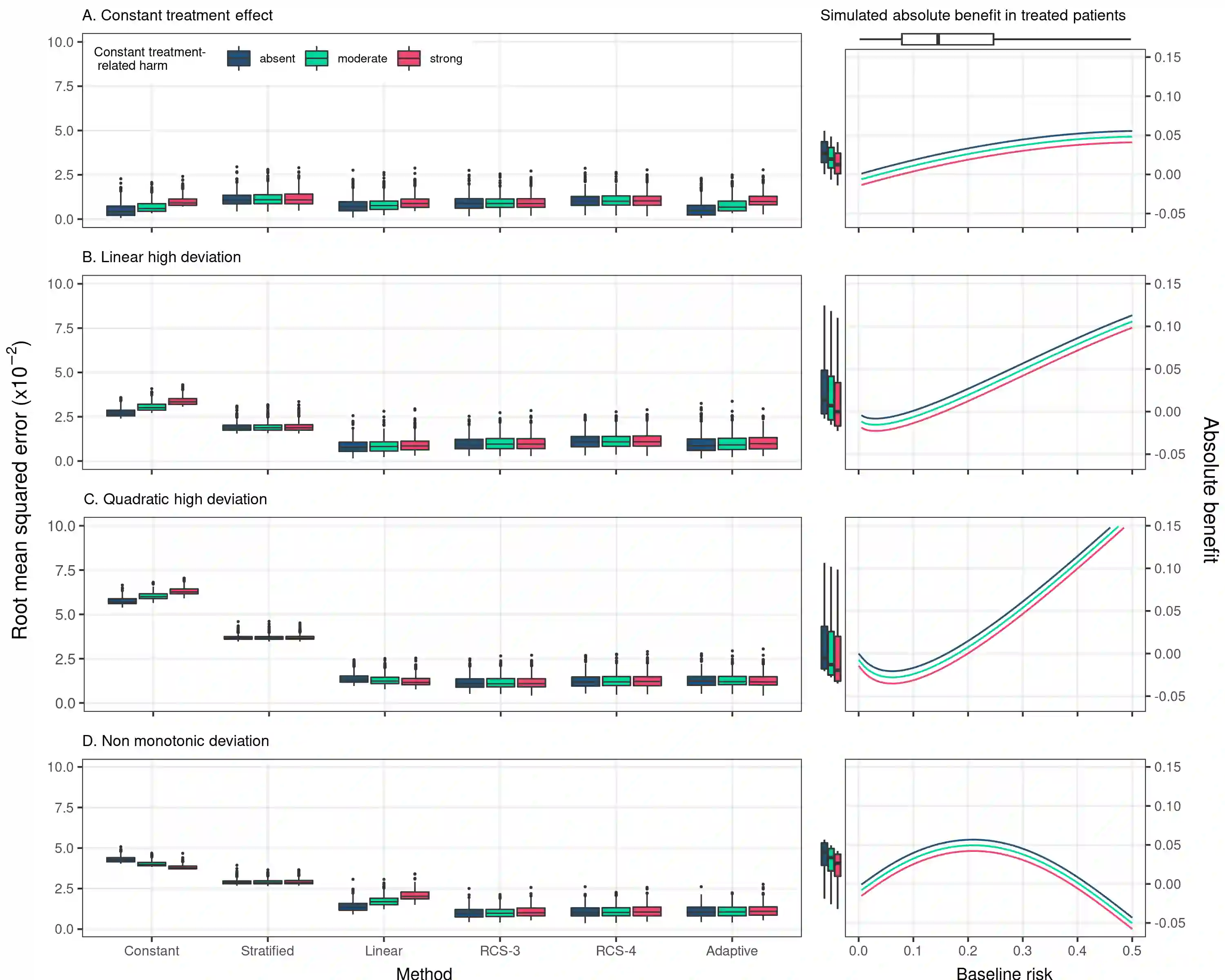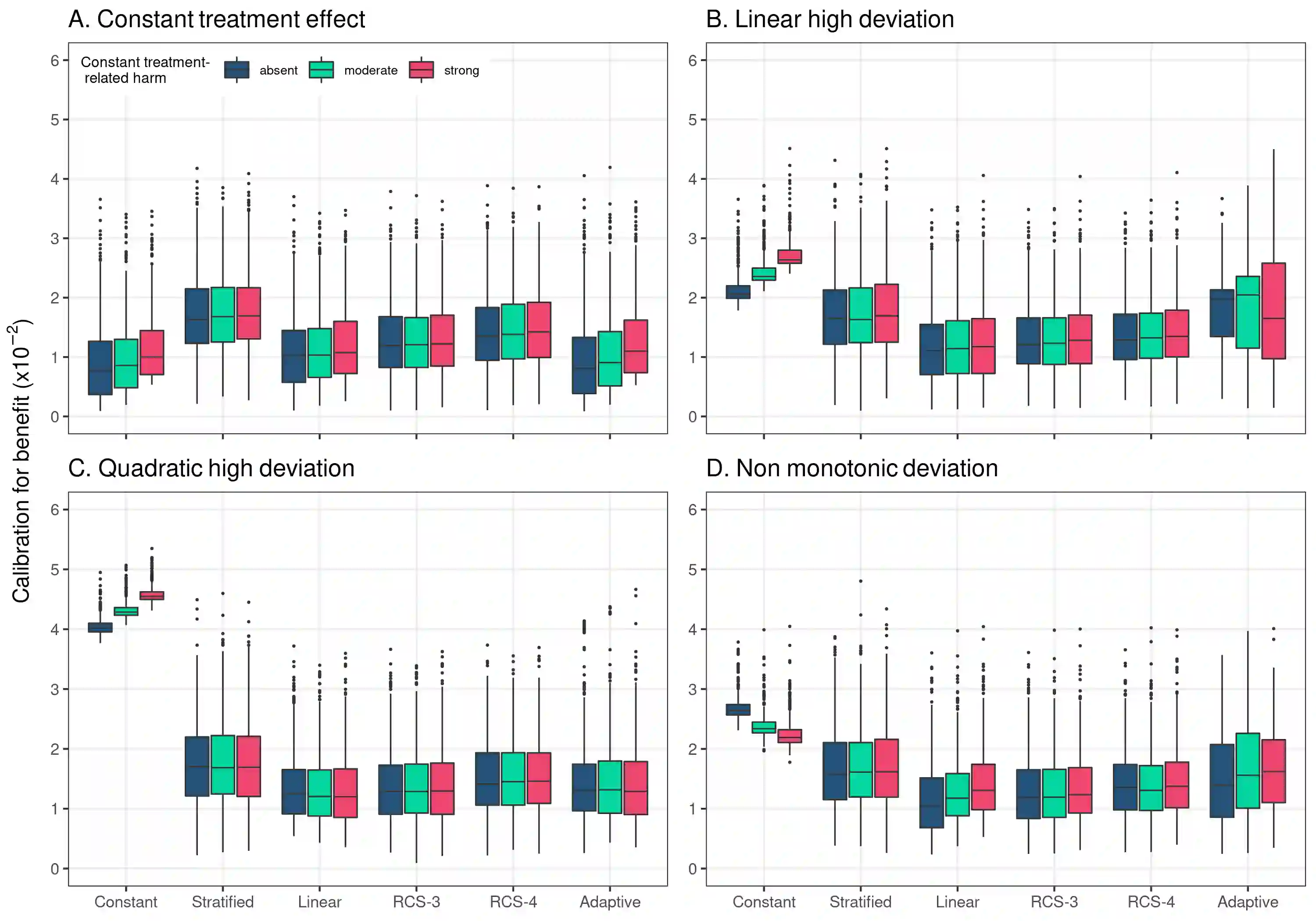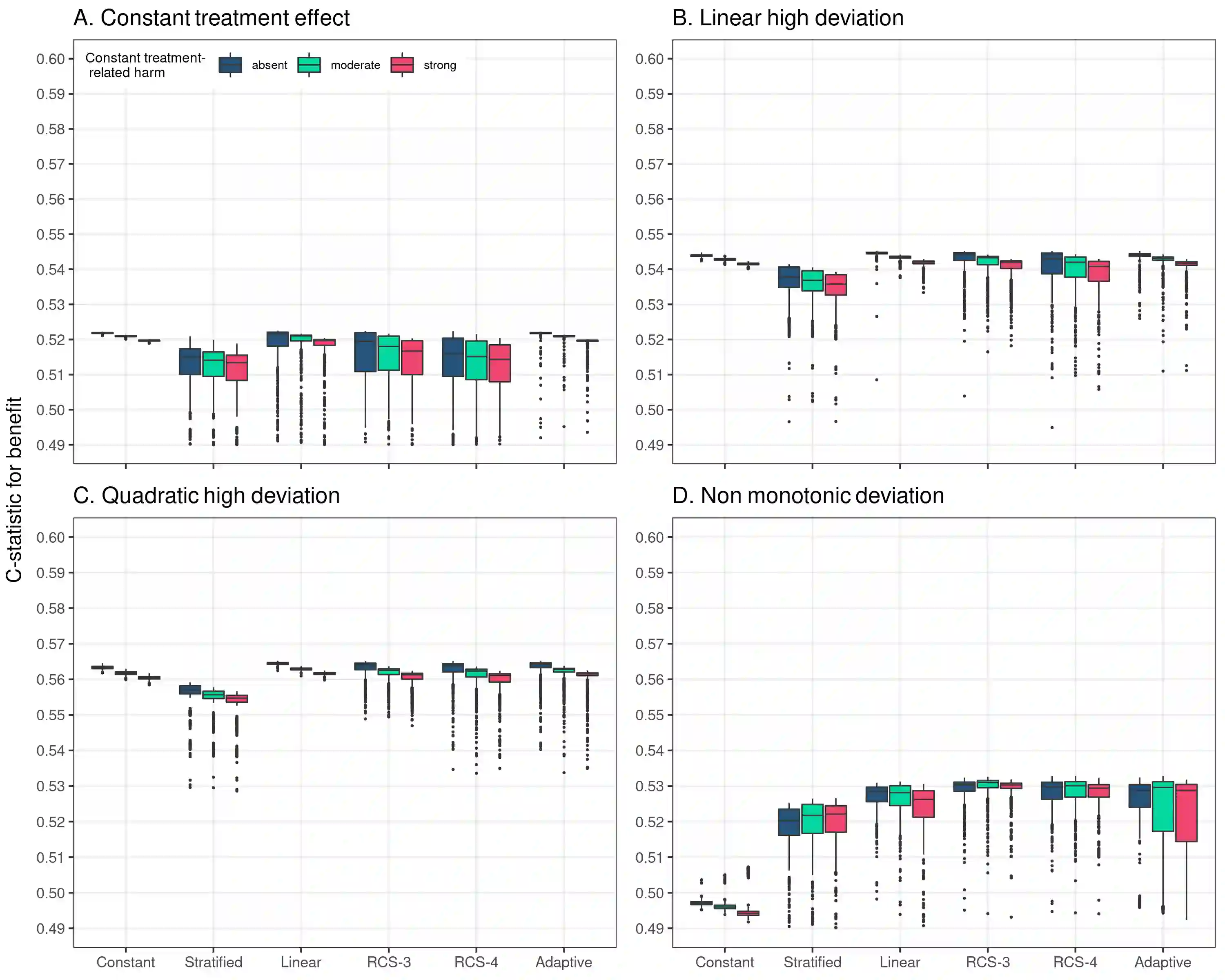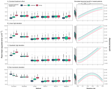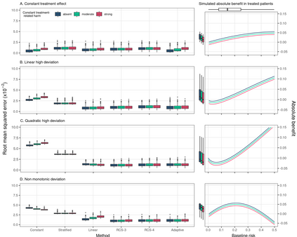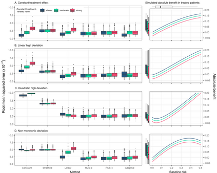 翻译:方法:我们模拟了RCT数据,使用了对平均治疗效果的不同假设、风险基准预测指数(PI)、其与治疗的相互作用(无、线性、二次或非双向),以及与治疗有关的伤害的程度(没有或经常独立于PI)。 我们预测了绝对效益,使用的是:具有持续相对治疗效果的模型;PI的分层;模型包括与PI的治疗的线性互动;模型包括治疗与PI的有限立方螺旋(RCS)转化的相互作用;利用Akaike的信息标准进行适应性方法;我们利用根平均值差、线性、二次或非单向偏差以及歧视和校准的衡量方法评估了预测性能。结果:线性互动模型展示了最佳或近于最佳的性性效果,在样本规模中等的多个模拟假设情景(N=4,250名病人;~785次事件)。RCS模型最适合从限制的立方螺旋线性螺旋线(RCS)疗法与PI的转化;使用Akaike的信息标准度调整方法;我们利用根平均值评价了预测性性性性性性性性性性性性工作,特别是当需要的GI的样本分析规模更大时,这些测试性评估性影响时,这种试验规模时,应当为最优化。