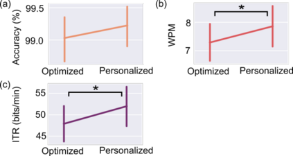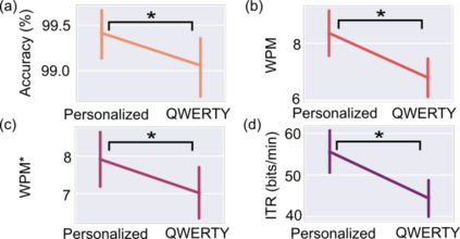 翻译:这项研究为个人化键盘生成引入了一种基于个人化键盘生成能力的方法,其中个人自己的移动和人-计算机互动数据被用于自动计算个性化虚拟键盘布局。我们的方法结合了多方向点选择任务,以辨别光标在时间、距离和方向上的控制特征。特征描述被自动用于开发一种计算高效键盘布局,通过捕捉方向限制和偏好,确定每个用户的移动能力的优先次序。我们用惯性感测和面部电感学作为一种访问方法,在16名无运动障碍的参与者参与的一项研究中评估了我们的方法,结果导致使用个性化键盘(52.0位/分钟)与一般优化键盘(47.9位/分钟)相比通信率大幅提高。我们的结果表明,在设计虚拟界面时,能够有效地描述个人设计个性化键盘用于改进通信的能力。这项工作强调了将用户的机动能力整合的重要性。