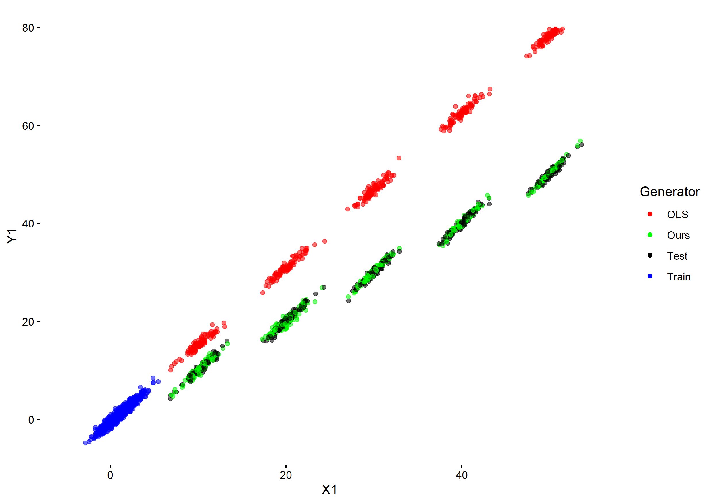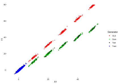 We present a new estimator for predicting outcomes in different distributional settings under hidden confounding without relying on instruments or exogenous variables. The population definition of our estimator identifies causal parameters, whose empirical version is plugged into a generative model capable of replicating the conditional law within a test environment. We check that the probabilistic affinity between our proposal and test distributions is invariant across interventions. This work enhances the current statistical comprehension of causality by demonstrating that predictions in a test environment can be made without the need for exogenous variables and without specific assumptions regarding the strength of perturbations or the overlap of distributions.