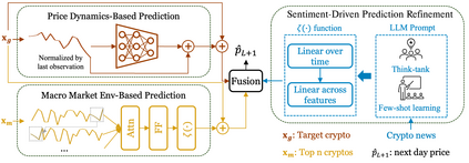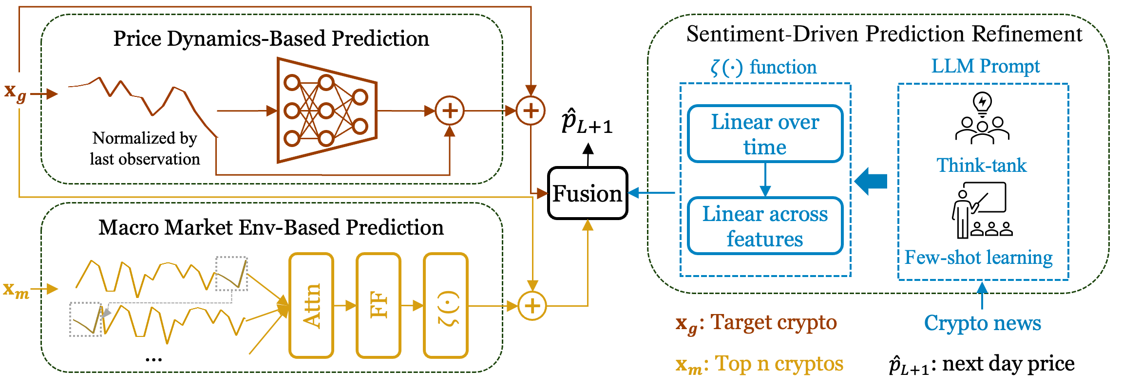 Cryptocurrencies fluctuate in markets with high price volatility, posing significant challenges for investors. To aid in informed decision-making, systems predicting cryptocurrency market movements have been developed, typically focusing on historical patterns. However, these methods often overlook three critical factors influencing market dynamics: 1) the macro investing environment, reflected in major cryptocurrency fluctuations affecting collaborative investor behaviors; 2) overall market sentiment, heavily influenced by news impacting investor strategies; and 3) technical indicators, offering insights into overbought or oversold conditions, momentum, and market trends, which are crucial for short-term price movements. This paper proposes a dual prediction mechanism that forecasts the next day's closing price by incorporating macroeconomic fluctuations, technical indicators, and individual cryptocurrency price changes. Additionally, a novel refinement mechanism enhances predictions through market sentiment-based rescaling and fusion. Experiments demonstrate that the proposed model achieves state-of-the-art performance, consistently outperforming ten comparison methods.