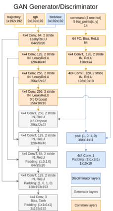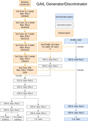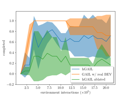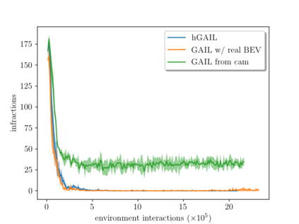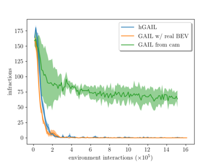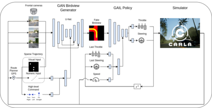 Deriving robust control policies for realistic urban navigation scenarios is not a trivial task. In an end-to-end approach, these policies must map high-dimensional images from the vehicle's cameras to low-level actions such as steering and throttle. While pure Reinforcement Learning (RL) approaches are based exclusively on rewards,Generative Adversarial Imitation Learning (GAIL) agents learn from expert demonstrations while interacting with the environment, which favors GAIL on tasks for which a reward signal is difficult to derive. In this work, the hGAIL architecture was proposed to solve the autonomous navigation of a vehicle in an end-to-end approach, mapping sensory perceptions directly to low-level actions, while simultaneously learning mid-level input representations of the agent's environment. The proposed hGAIL consists of an hierarchical Adversarial Imitation Learning architecture composed of two main modules: the GAN (Generative Adversarial Nets) which generates the Bird's-Eye View (BEV) representation mainly from the images of three frontal cameras of the vehicle, and the GAIL which learns to control the vehicle based mainly on the BEV predictions from the GAN as input.Our experiments have shown that GAIL exclusively from cameras (without BEV) fails to even learn the task, while hGAIL, after training, was able to autonomously navigate successfully in all intersections of the city.