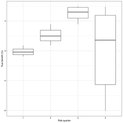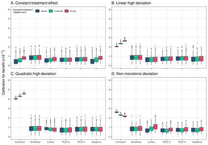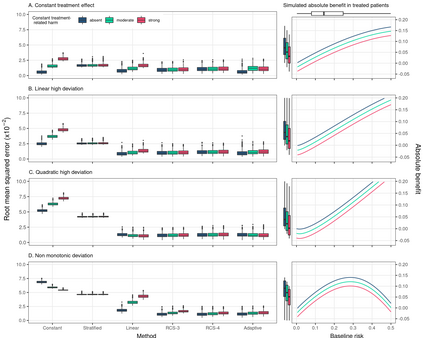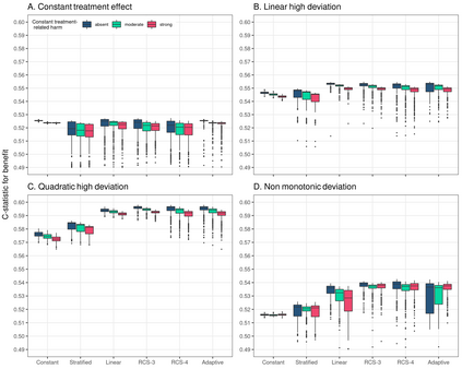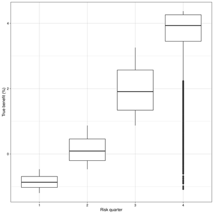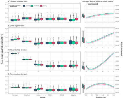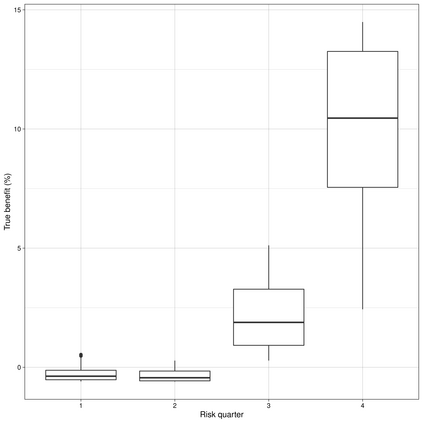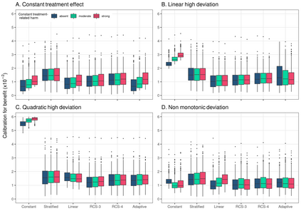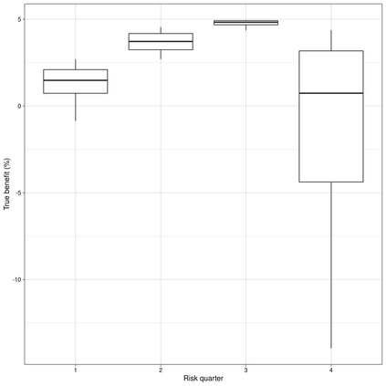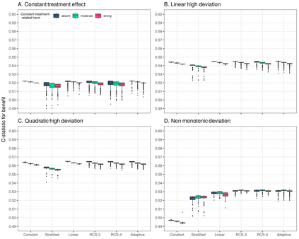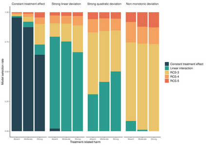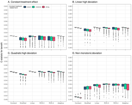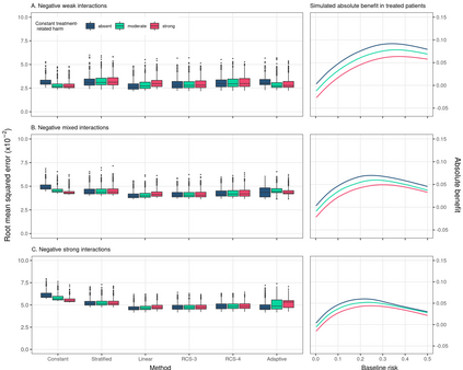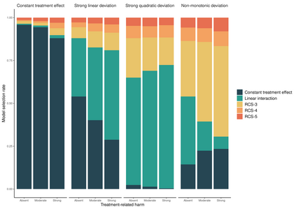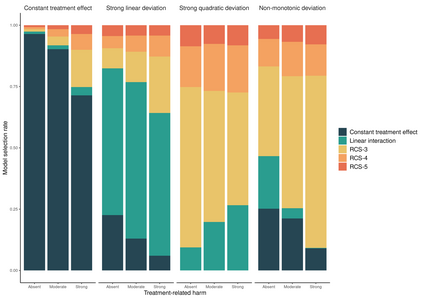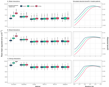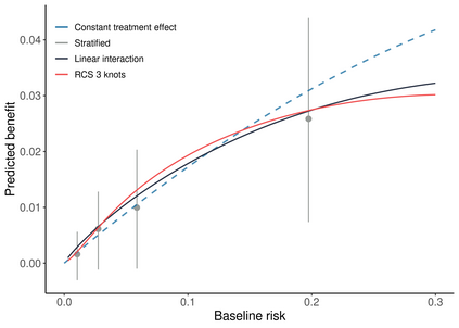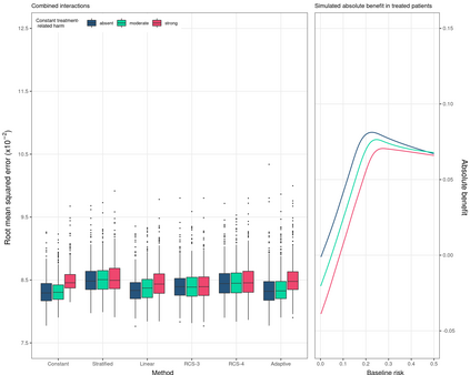 翻译:方法:我们模拟了RCT数据,使用了对平均治疗效果的不同假设、风险基准预测指数(PI)、其与治疗的相互作用(无、线性、二次或非双向),以及与治疗有关的伤害的程度(没有或经常独立于PI)。 我们预测了绝对效益,使用的是:具有持续相对治疗效果的模型;PI的分层;模型包括与PI的治疗的线性互动;模型包括治疗与PI的有限立方螺旋(RCS)转化的相互作用;利用Akaike的信息标准进行适应性方法;我们利用根平均值差、线性、二次或非单向偏差以及歧视和校准的衡量方法评估了预测性能。结果:线性互动模型展示了最佳或近于最佳的性性效果,在样本规模中等的多个模拟假设情景(N=4,250名病人;~785次事件)。RCS模型最适合从限制的立方螺旋线性螺旋线(RCS)疗法与PI的转化;使用Akaike的信息标准度调整方法;我们利用根平均值评价了预测性性性性性性性性性性性性工作,特别是当需要的GI的样本分析规模更大时,这些测试性评估性影响时,这种试验规模时,应当为最优化。