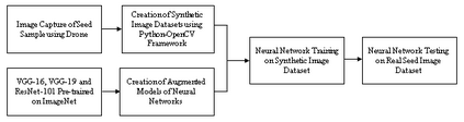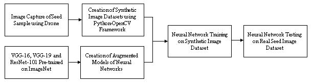 Plant breeding programs extensively monitor the evolution of seed kernels for seed certification, wherein lies the need to appropriately label the seed kernels by type and quality. However, the breeding environments are large where the monitoring of seed kernels can be challenging due to the minuscule size of seed kernels. The use of unmanned aerial vehicles aids in seed monitoring and labeling since they can capture images at low altitudes whilst being able to access even the remotest areas in the environment. A key bottleneck in the labeling of seeds using UAV imagery is drone altitude i.e. the classification accuracy decreases as the altitude increases due to lower image detail. Convolutional neural networks are a great tool for multi-class image classification when there is a training dataset that closely represents the different scenarios that the network might encounter during evaluation. The article addresses the challenge of training data creation using Domain Randomization wherein synthetic image datasets are generated from a meager sample of seeds captured by the bottom camera of an autonomously driven Parrot AR Drone 2.0. Besides, the article proposes a seed classification framework as a proof-of-concept using the convolutional neural networks of Microsoft's ResNet-100, Oxford's VGG-16, and VGG-19. To enhance the classification accuracy of the framework, an ensemble model is developed resulting in an overall accuracy of 94.6%.