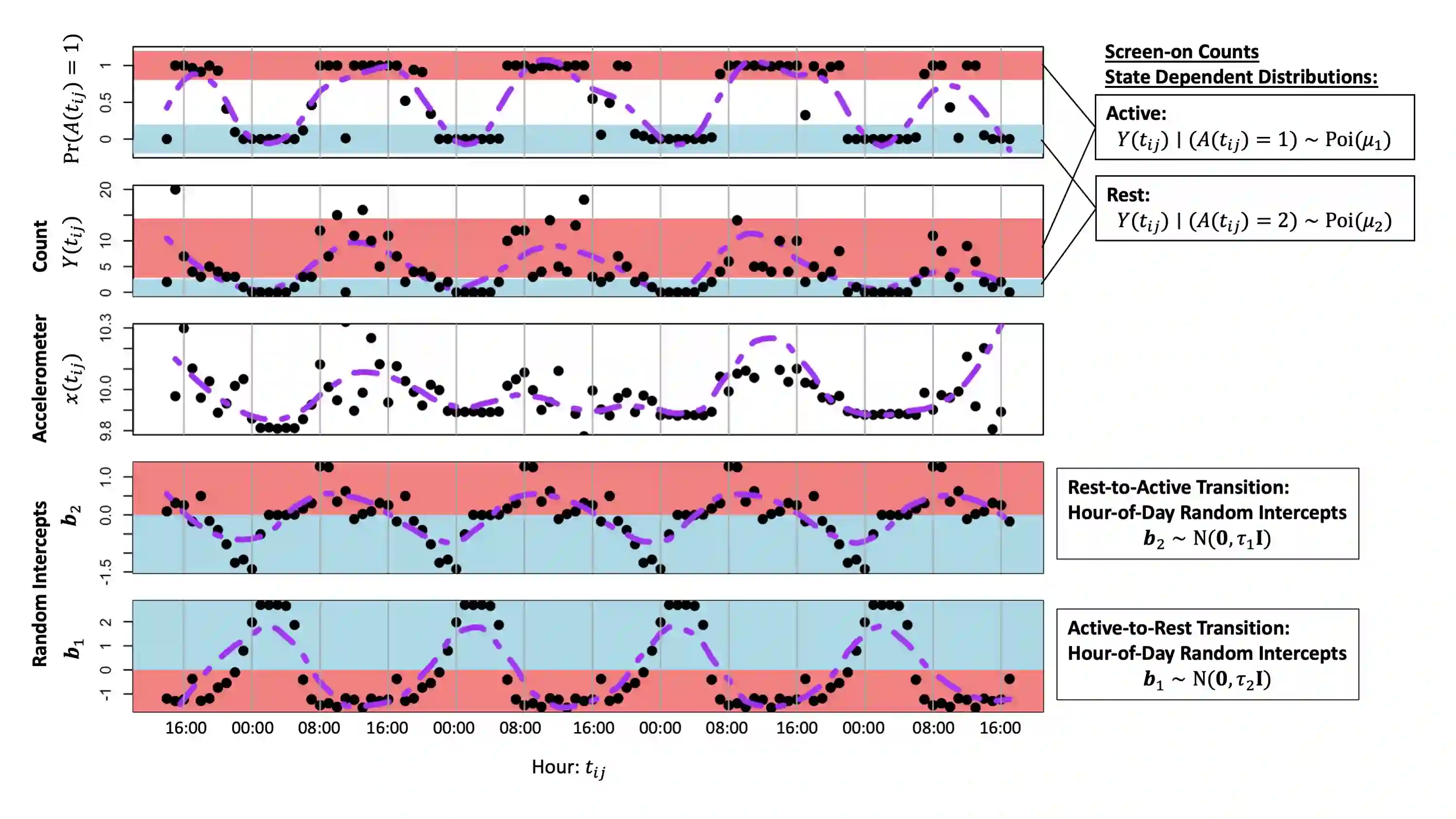 翻译:从磨损装置和智能手机中收集的数据可以揭示个人的行为和环状常规模式。 电话使用可以建模为交替事件过程, 从积极使用状态到闲置状态之间的交替事件过程。 Markov 链条和交替事件模式通常用于模拟此类情况下的状态过渡, 而随机效应的结合可以用来引入二极效应。 虽然在模拟动态之前可以得出国家标签, 但这种方法可以省略影响州会会员身份的知情回归共变。 我们提议以交替的经常性事件按比例危害( PH) 回归为模式, 以模拟潜伏状态之间的过渡。 我们提议了估算潜在状态标签和估计回归参数的预期- 最大化算法。 我们表明,我们的E步骤会简化到隐藏的Markov 模型(HMM) 前向后方算法, 使我们能够用物流回归过渡的概率恢复 HMMIC 。 此外, 我们表示, 离散时间过渡模式(PH) 的模型会以隐含性回归可能性和结果来模拟智能州际关系分析模型, 将我们作为模拟模型分析的模型分析模型分析方法, 模拟分析分析的模型的模型分析分析分析中, 分析分析中, 分析分析分析分析中, 分析分析分析分析分析中, 分析分析分析分析分析分析中,, 分析分析中的分析分析分析中的分析分析中的分析分析分析分析分析中的分析分析分析中的分析分析分析分析分析中的方法,, 分析分析。