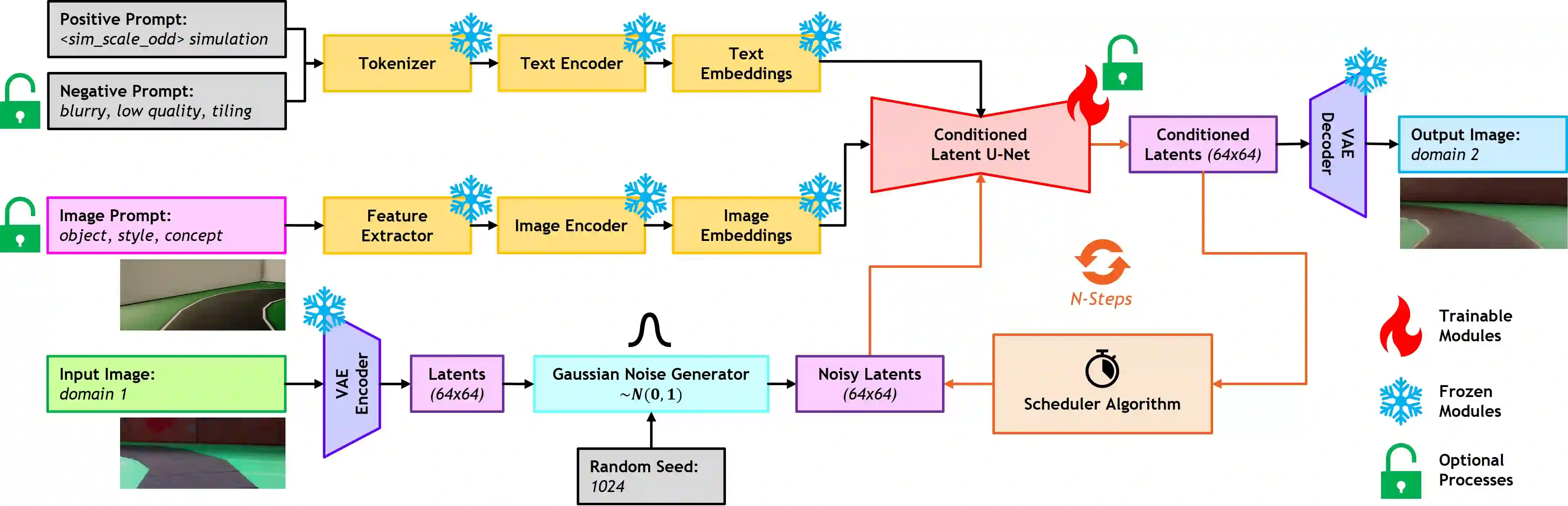 翻译:基于仿真的自动驾驶车辆设计、优化与验证已被证明对其长期改进至关重要。然而,最终衡量其有效性的标准在于能否成功实现从仿真到现实的迁移(sim2real)。现有sim2real迁移方法难以平衡以下面向自主性的需求:(i) 条件化领域自适应,(ii) 有限样本下的鲁棒性能,(iii) 多领域表征处理的模块化,以及(iv) 实时性能。为缓解这些痛点,我们提出一个通过条件潜在扩散学习跨领域自适应表征的统一框架,用于实现sim2real可迁移的自动驾驶。该框架提供以下应用选项:(i) 可替换的基础模型,(ii) 少样本微调流程,以及(iii) 用于跨给定源域与目标域映射的文本与图像提示。该框架还能在扩散过程中跨越时间(如昼夜)、天气条件、季节及运行设计域等参数空间生成多样化高质量样本。我们对所提框架进行系统分析,并通过性能基准测试与消融实验报告研究结果。此外,我们通过行为克隆案例研究论证了其在自动驾驶中的实用性。实验表明,所提框架能够将感知层面的sim2real差距缩小超过40%。