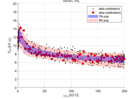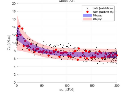 翻译:Bit-rock 互动关系在很大程度上影响到钻头字符串的动态。 一个关键条件就是刺滑振动, 其振动的振动非常高; 位角速度从零到大约是顶驱动器表面角速度的两次( 两次或两次以上) 。 此外, 在校准( 识别) Bit-rock 互动参数时, 应考虑到不确定性。 本文建议了一种程序, 来估计四个比特岩石互动模型的参数, 其中一种是新的, 同时选择最合适的模型, 并参考可用的字段数据。 为此使用了近似 Bayesian 的计算( ABC ) 。 每个模型的参数都获得了近似远地点概率密度函数, 从而可以分析不确定性。 此外, 将评估选定模型对 torsisonal 稳定性 地图( 标称顶驱动器角速度和位数重量) 的不确定性对系统图的影响 。