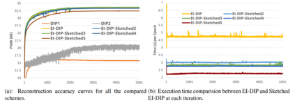 Equivariant Imaging (EI) regularization has become the de-facto technique for unsupervised training of deep imaging networks, without any need of ground-truth data. Observing that the EI-based unsupervised training paradigm currently has significant computational redundancy leading to inefficiency in high-dimensional applications, we propose a sketched EI regularization which leverages the randomized sketching techniques for acceleration. We then extend our sketched EI regularization to develop an accelerated deep internal learning framework -- Sketched Equivariant Deep Image Prior (Sk-EI-DIP), which can be efficiently applied for single-image and task-adapted reconstruction. Additionally, for network adaptation tasks, we propose a parameter-efficient approach for accelerating both EI-DIP and Sk-EI-DIP via optimizing only the normalization layers. Our numerical study on X-ray CT image reconstruction tasks demonstrate that our approach can achieve order-of-magnitude computational acceleration over standard EI-based counterpart in single-input setting, and network adaptation at test time.