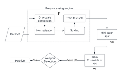 Weapon and gun violence have recently become a pressing issue today. The degree of these crimes and activities has risen to the point of being termed as an epidemic. This prevalent misuse of weapons calls for an automatic system that detects weapons in real-time. Real-time surveillance video is captured and recorded in almost all public forums and places. These videos contain abundant raw data which can be extracted and processed into meaningful information. This paper proposes a novel pipeline consisting of an ensemble of convolutional neural networks with distinct architectures. Each neural network is trained with a unique mini-batch with little to no overlap in the training samples. This paper will present several promising results using multiple datasets associated with comparing the proposed architecture and state-of-the-art (SoA) models. The proposed pipeline produced an average increase of 5% in accuracy, specificity, and recall compared to the SoA systems.