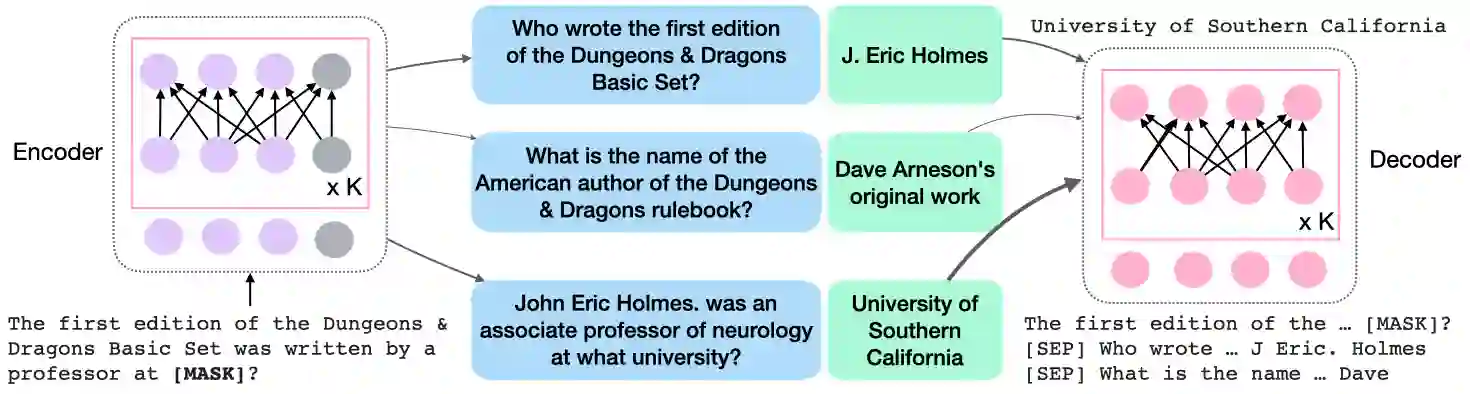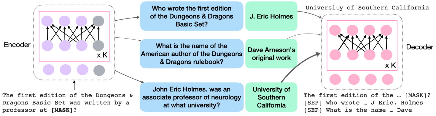 翻译:重新获取增强的语言模型最近已成为知识密集型任务的标准。 这些方法不是完全依靠大型神经模型参数范围内的潜在语义学,而是利用半参数内存来编码模型要检索的知识索引。 大部分以前的工作都采用文本段落作为知识单位, 以可解释性、可控性和效率为代价, 其覆盖面高, 以可理解性、 可控性和效率为代价。 相反的特性出现在其他方法中, 而这些方法则以知识基础( KB) 事实为根据。 与此同时, 较近期的工作表明, 从文本 \ citep{ lewis2021paq} 衍生的Q-A配对索引中存储和检索的功效。 这种方法产生了一个高覆盖面的知识代表, 保持KB相似的属性, 因为它的表达方式是更多的原子信息单位。 在这项工作中,我们进一步推进了这一研究线,方法是提出一个问题解答, 增强编码解析模式和伴随的培训前战略。 这产生了一个端到端系统,不仅超越了以前从文本 QA 双检索方法, 改进了单一QA 能力分析系统, 改进了业绩分析方法, 也使业绩分析了这些系统得以进行更精确分析。