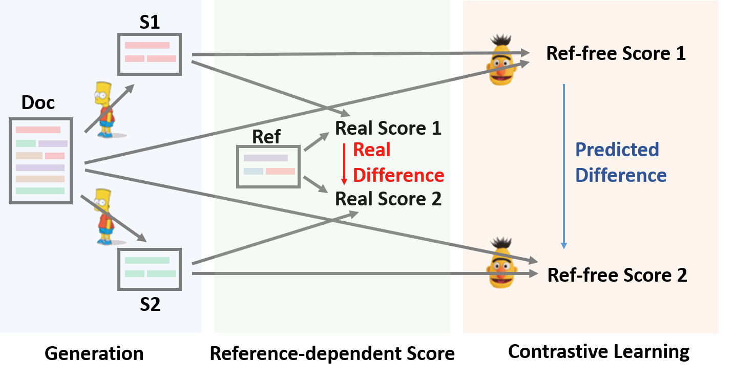 翻译:在本文中,我们提出了一个概念简单、经验上强大的抽象总结框架,即SimCLS。 SimCLS通过将文本生成作为无参考评价问题(即质量估计),并辅之以对比性学习,可以弥合目前占主导地位的顺序至顺序学习框架所产生的学习目标和评价指标之间的差距。实验结果表明,由于对现有顶层分层系统稍作修改,SimCLS能够大大改善现有顶级模型的性能。特别是,在CNN/DailyMail数据集中,与BART和PEGASUS w.r.t ROUGE-1相比,SimCLS可以绝对改进2.51和2.50,将最新业绩提高到新的水平。我们公开提供了我们的代码和结果:https://github.com/yixinL7/SimCLS。我们提出的模型的结果被应用到ExleaBoard平台,使研究人员能够更精确地理解我们的系统。
