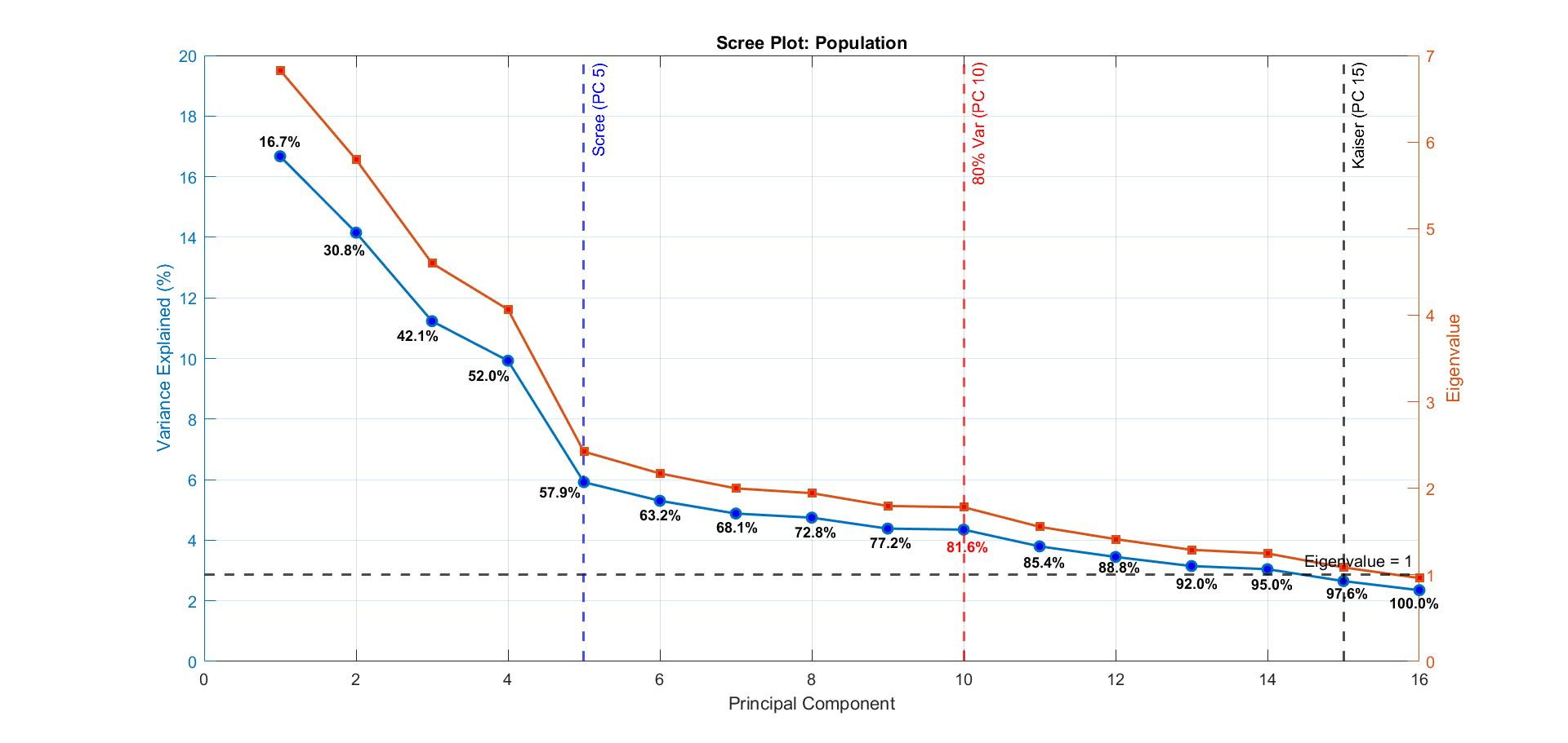 PCA is widely used in health and care research to analyze complex HD datasets, such as patient health records, genetic data, and medical imaging. By reducing dimensionality, PCA helps identify key patterns and trends, which can aid in disease diagnosis, treatment optimization, and the discovery of new biomarkers. However, the primary goal of any dimensional reduction technique is to reduce the dimensionality in a data set while keeping the essential information and variability. There are a few ways to do this in practice, such as the Kaiser-Guttman criterion, Cattell's Scree Test, and the percent cumulative variance approach. Unfortunately, the results of these methods are entirely different. That means using inappropriate methods to find the optimal number of PCs retained in PCA may lead to misinterpreted and inaccurate results in PCA and PCA-related health and care research applications. This contradiction becomes even more pronounced in HD settings where n < p, making it even more critical to determine the best approach. Therefore, it is necessary to identify the issues of different techniques to select the optimal number of PCs retained in PCA. Kaiser-Guttman criterion retains fewer PCs, causing overdispersion, while Cattell's scree test retains more PCs, compromising reliability. The percentage of cumulative variation criterion offers greater stability, consistently selecting the optimal number of components. Therefore, the Pareto chart, which shows both the cumulative percentage and the cut-off point for retained PCs, provides the most reliable method of selecting components, ensuring stability and enhancing PCA effectiveness, particularly in health-related research applications.