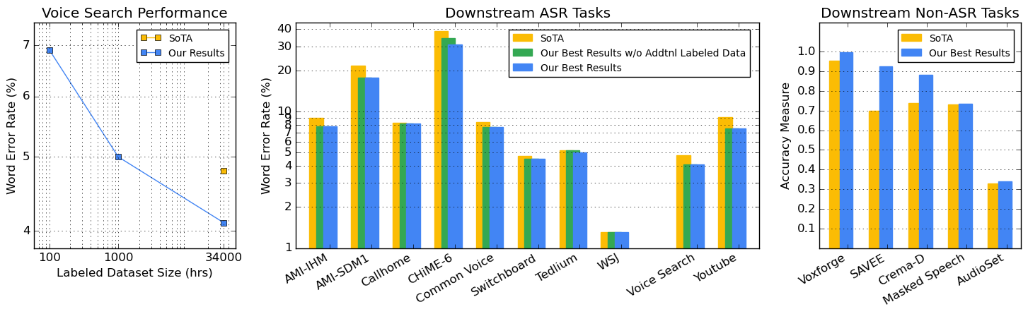 翻译:我们总结了使用大型自动语音识别(ASR)模型所做的大量努力的结果,这些模型是使用含有大约100万小时音频的大型、多种无标签数据集进行预先培训的。我们发现,将培训前、自我培训和扩大模型规模结合起来,大大提高了数据效率,即使对于涉及数万小时标签数据的巨大任务也是如此。特别是,在具有34千小时标签数据的ASR任务方面,我们通过微调一个80亿参数的预培训后模型,我们可以将培训前最先进的功能与仅3%的培训数据匹配起来,并大大改进SoTA全套培训。我们还报告了使用大型培训前和自我培训模式,用于涵盖广泛的语音领域并跨越多层次数据集大小的大型下游任务,包括在许多公共基准上获得SoTA的绩效,从而获得普遍效益。此外,我们利用培训前网络的经验,在非ASA任务上取得结果。