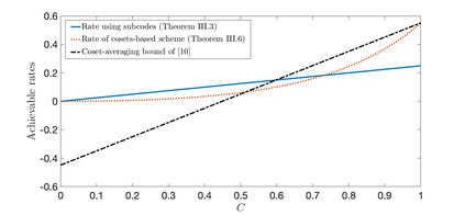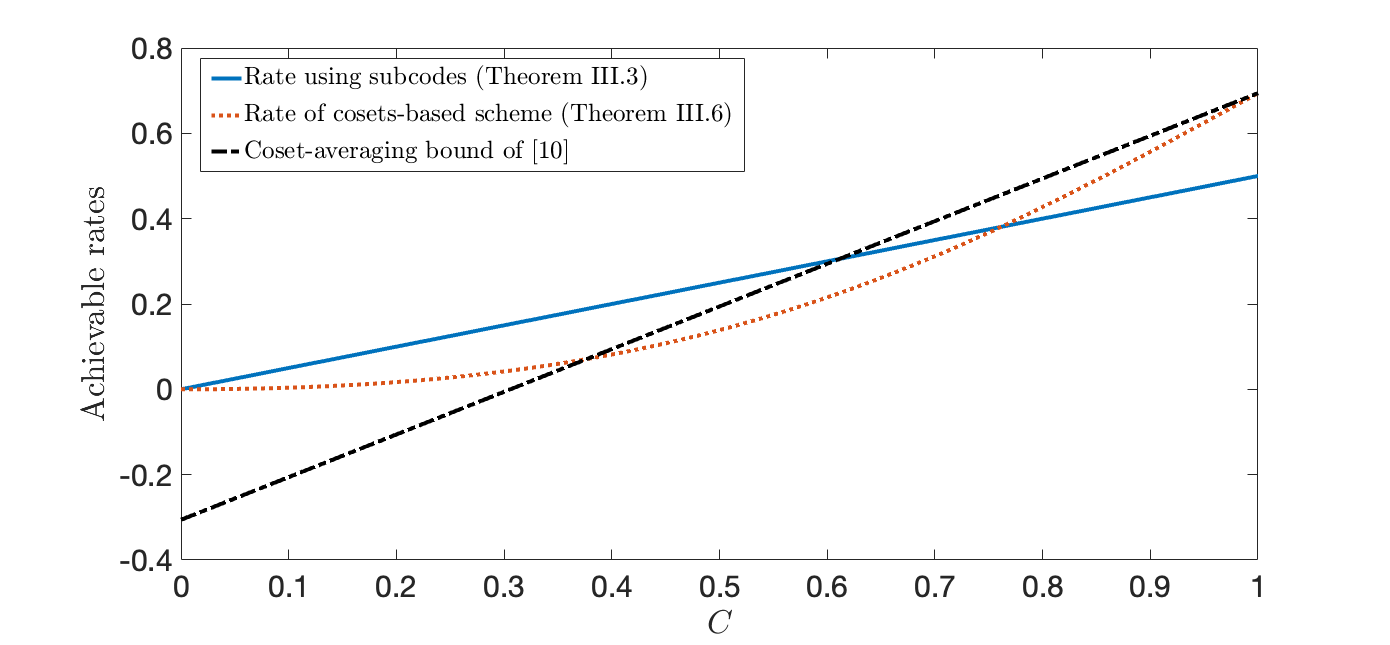 翻译:在这项工作中,我们处理的是Reed-Muller(RM)代码线性子代码的最大比例值问题,所有代码都尊重限值限制的限值限制。我们感兴趣的是$(d),\infty)$-RLL(RL)限制,这要求每对连续一美元的代码至少分离美元美元。考虑到任何序列,美元=mathcal{C ⁇ m\geq 1美元,轮长增加,费率接近R$(美元),在轮长到不精确的限度内限内。我们还要研究对于任何线性美元(d,infty)$-RLLL(美元)子代码,$\hhat\mathcal{C%m(美元),这要求每对连续一对一对一对一美元,每对每对每对每对每对一的一一美元, 美元,每对每对每对每对每对每对每对每对每对一美元,至少美元,每对每对每对每对每对每对每对一美元, 美元, 美元,每对每对每对每对每对每对每对每对每对每对的,每对,每对,每对,每对每对每对每对,每对每对每对每对每对每对一个,每对每对,每对,每对,每对每对,每对,每对,每对每对每对每对每对,每对,每对,每对一个, 美元, 美元, 美元,每对,每对,每整整整整一个,每对一个,每整一个,每对一次,每对一个,其,其,每对一个,每对一个,每对一个,每对一次,每对一个,每对一次,每对一次,每对一个,每对一个,每对一个,每对一个,每对一个,每对一个,每对一个,每对一个,每对一个,每对一个,每对一个,每对一个,每计算一个,每计算一个,每计算一个,每计算一个,每计算一个,每计算一个,每递一次,每计算的计算的计算的,每计算的计算的计算的计算的计算的计算的,每