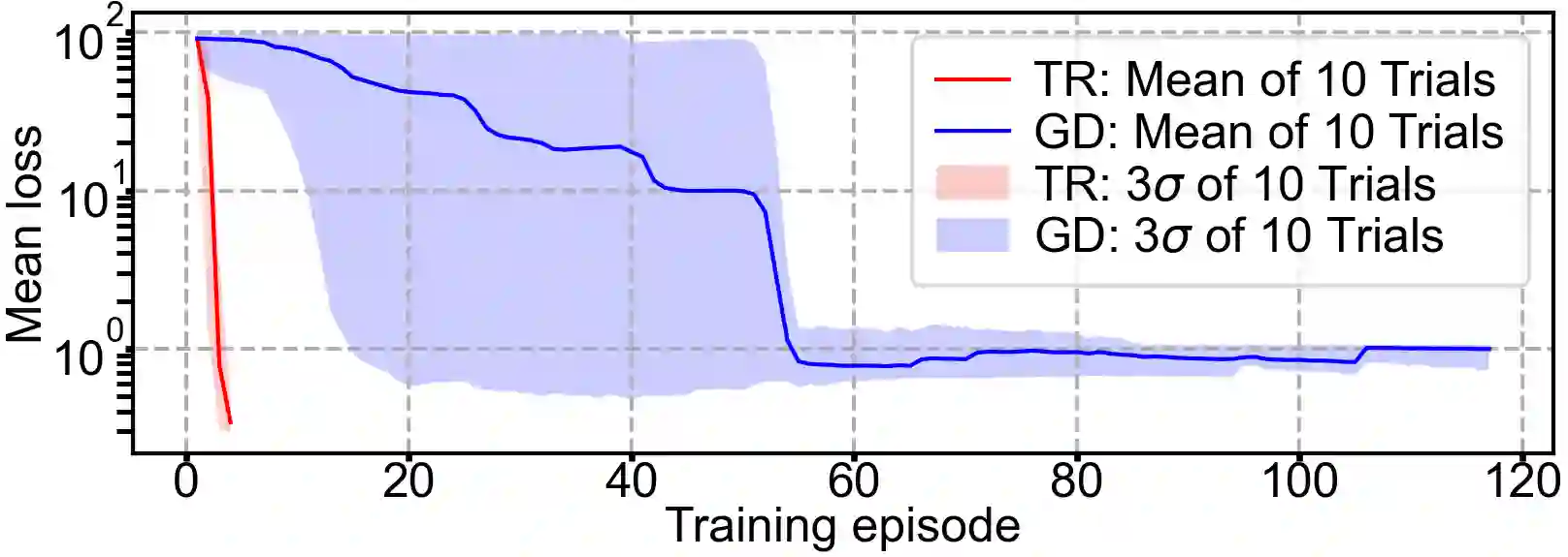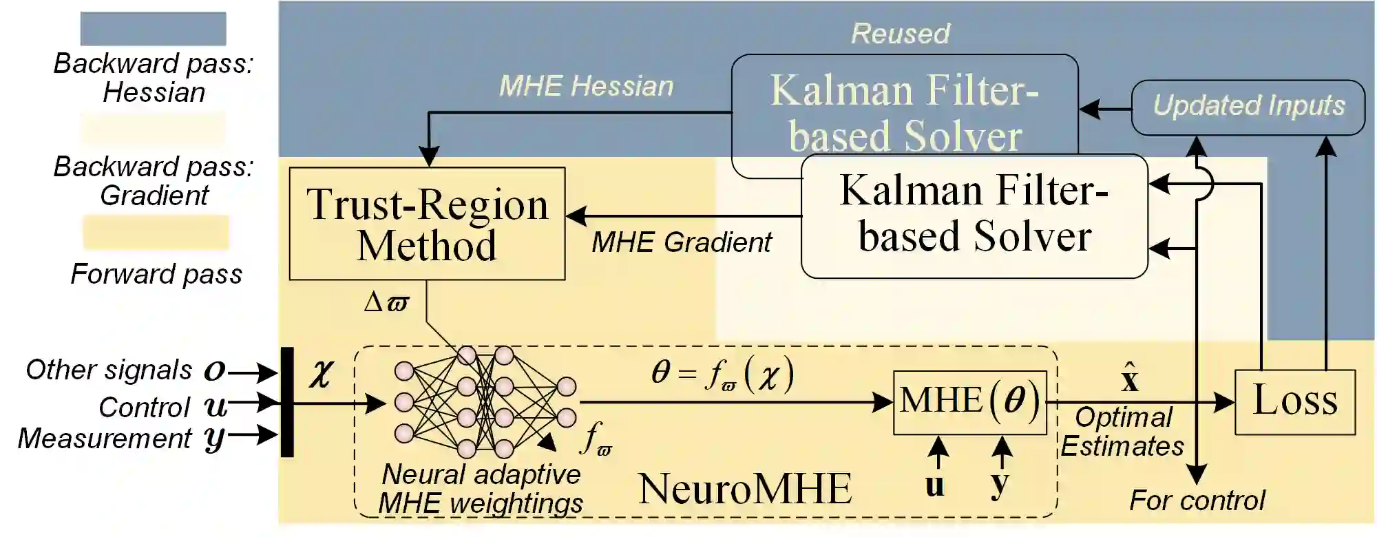 Accurate disturbance estimation is essential for safe robot operations. The recently proposed neural moving horizon estimation (NeuroMHE), which uses a portable neural network to model the MHE's weightings, has shown promise in further pushing the accuracy and efficiency boundary. Currently, NeuroMHE is trained through gradient descent, with its gradient computed recursively using a Kalman filter. This paper proposes a trust-region policy optimization method for training NeuroMHE. We achieve this by providing the second-order derivatives of MHE, referred to as the MHE Hessian. Remarkably, we show that much of computation already used to obtain the gradient, especially the Kalman filter, can be efficiently reused to compute the MHE Hessian. This offers linear computational complexity relative to the MHE horizon. As a case study, we evaluate the proposed trust region NeuroMHE on real quadrotor flight data for disturbance estimation. Our approach demonstrates highly efficient training in under 5 min using only 100 data points. It outperforms a state-of-the-art neural estimator by up to 68.1% in force estimation accuracy, utilizing only 1.4% of its network parameters. Furthermore, our method showcases enhanced robustness to network initialization compared to the gradient descent counterpart.