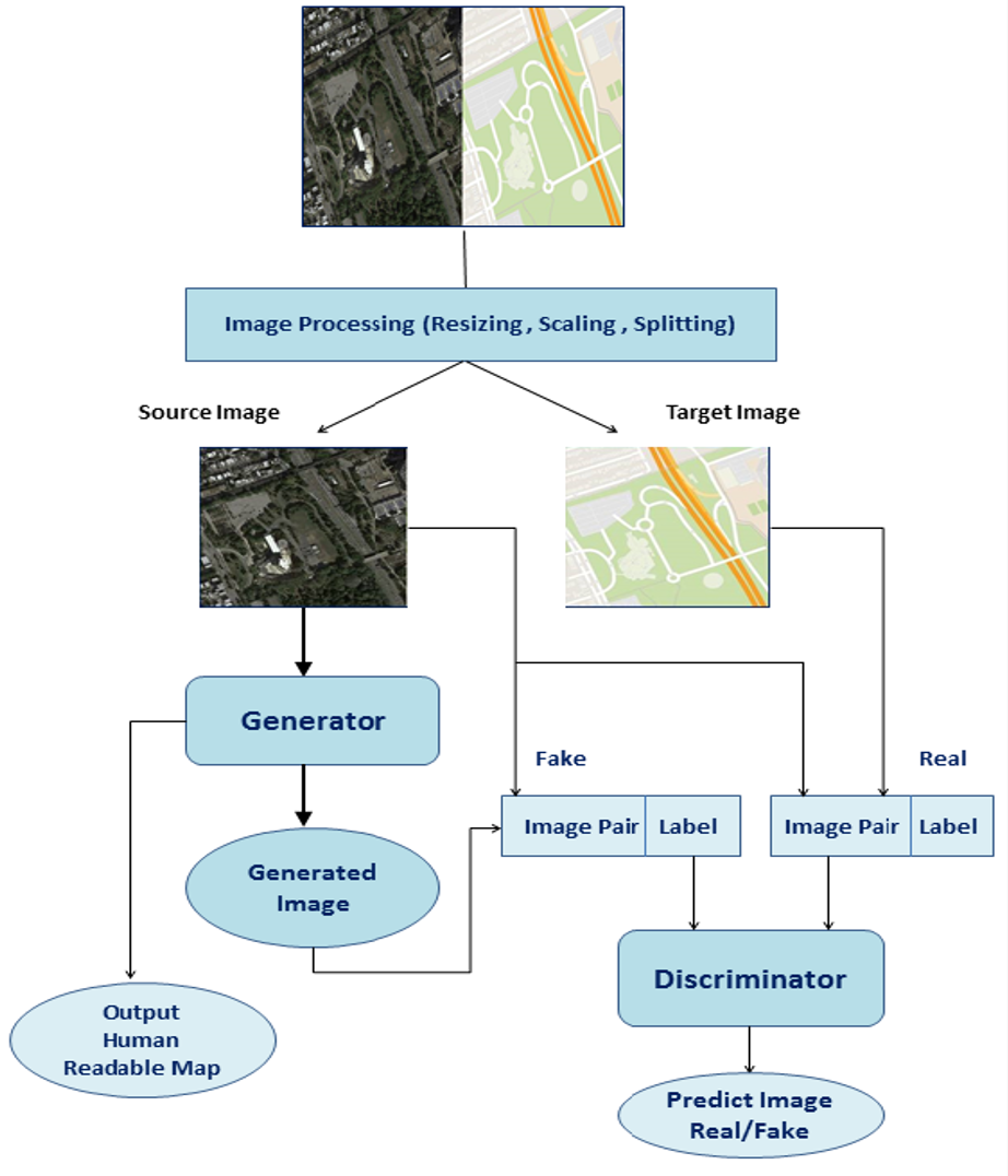 Generation of maps from satellite images is conventionally done by a range of tools. Maps became an important part of life whose conversion from satellite images may be a bit expensive but Generative models can pander to this challenge. These models aims at finding the patterns between the input and output image. Image to image translation is employed to convert satellite image to corresponding map. Different techniques for image to image translations like Generative adversarial network, Conditional adversarial networks and Co-Variational Auto encoders are used to generate the corresponding human-readable maps for that region, which takes a satellite image at a given zoom level as its input. We are training our model on Conditional Generative Adversarial Network which comprises of Generator model which which generates fake images while the discriminator tries to classify the image as real or fake and both these models are trained synchronously in adversarial manner where both try to fool each other and result in enhancing model performance.