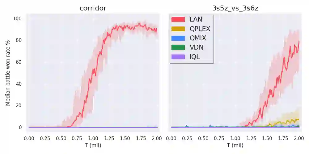 翻译:多剂强化学习(MARL)使我们得以在具有挑战性的环境中创造适应性剂,即使代理商观察有限。现代MARL方法侧重于寻找要素化价值功能。现代MARL方法虽然成功,但有助于找到要素化价值功能。由此产生的方法具有复杂的网络结构。我们采取了完全不同的方法,并依靠独立的Q-learners的结构。我们的局域网算法利用分权结构代表分散政策,作为单独的个人优势函数 w.r.t.\,在培训后被搁置的集中评论家。评论家作为一个稳定器,协调学习和制定DQN目标。这使得局域网能够保持其集中网络参数的数量在代理器数量上独立,而不会像单调值功能那样施加额外的限制。在对SMAC进行评价时,局域网显示SOTA的总体业绩,在两张超级硬地图中赢得了80多分,而即使QPLEX也几乎得不到任何优势。此外,当药剂数量大时,局网域网使用的参数大大少于QPLEX或QMIX。因此,我们显示局网的结构构成关键的改进是能够帮助MAL的方法。