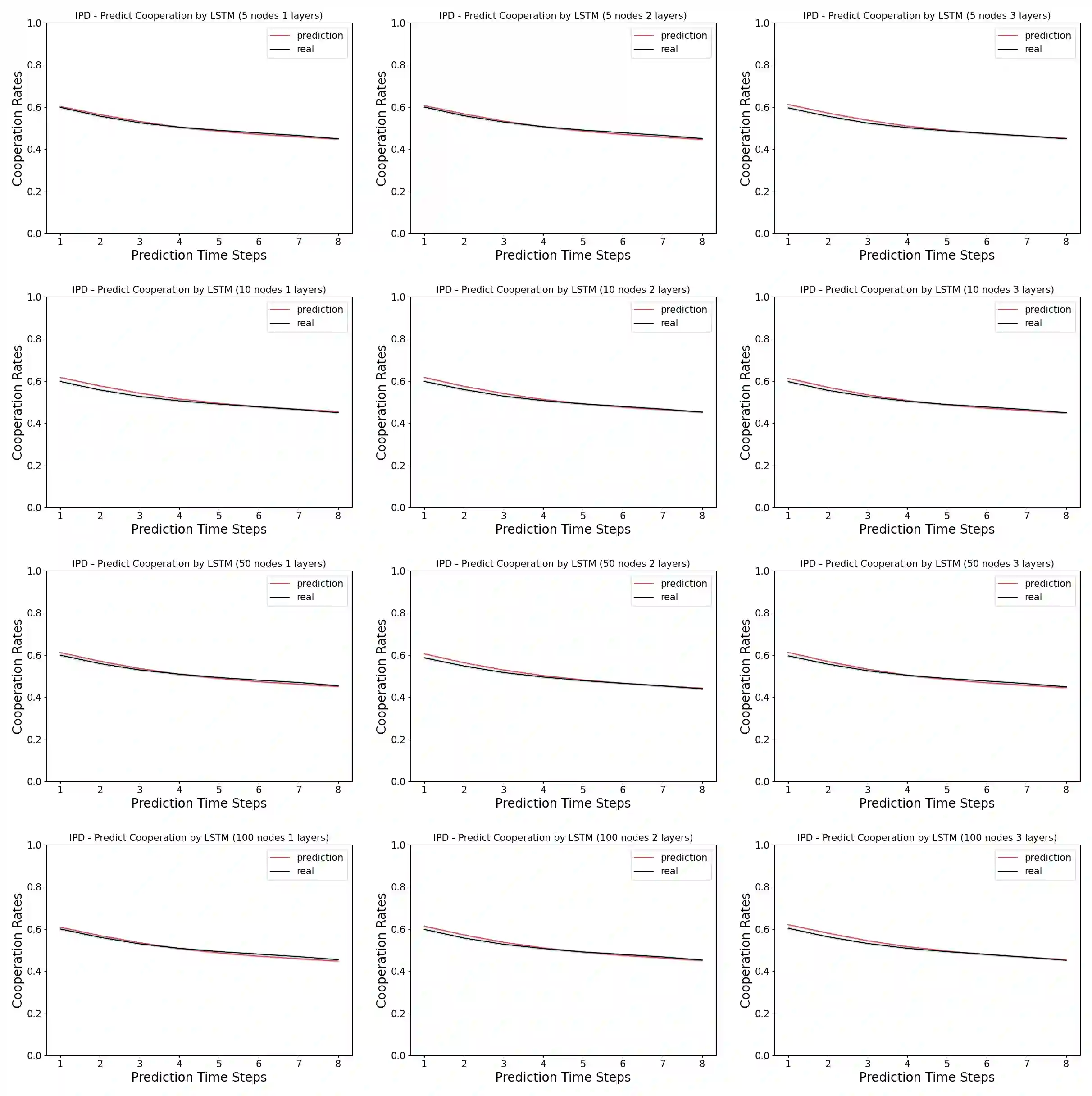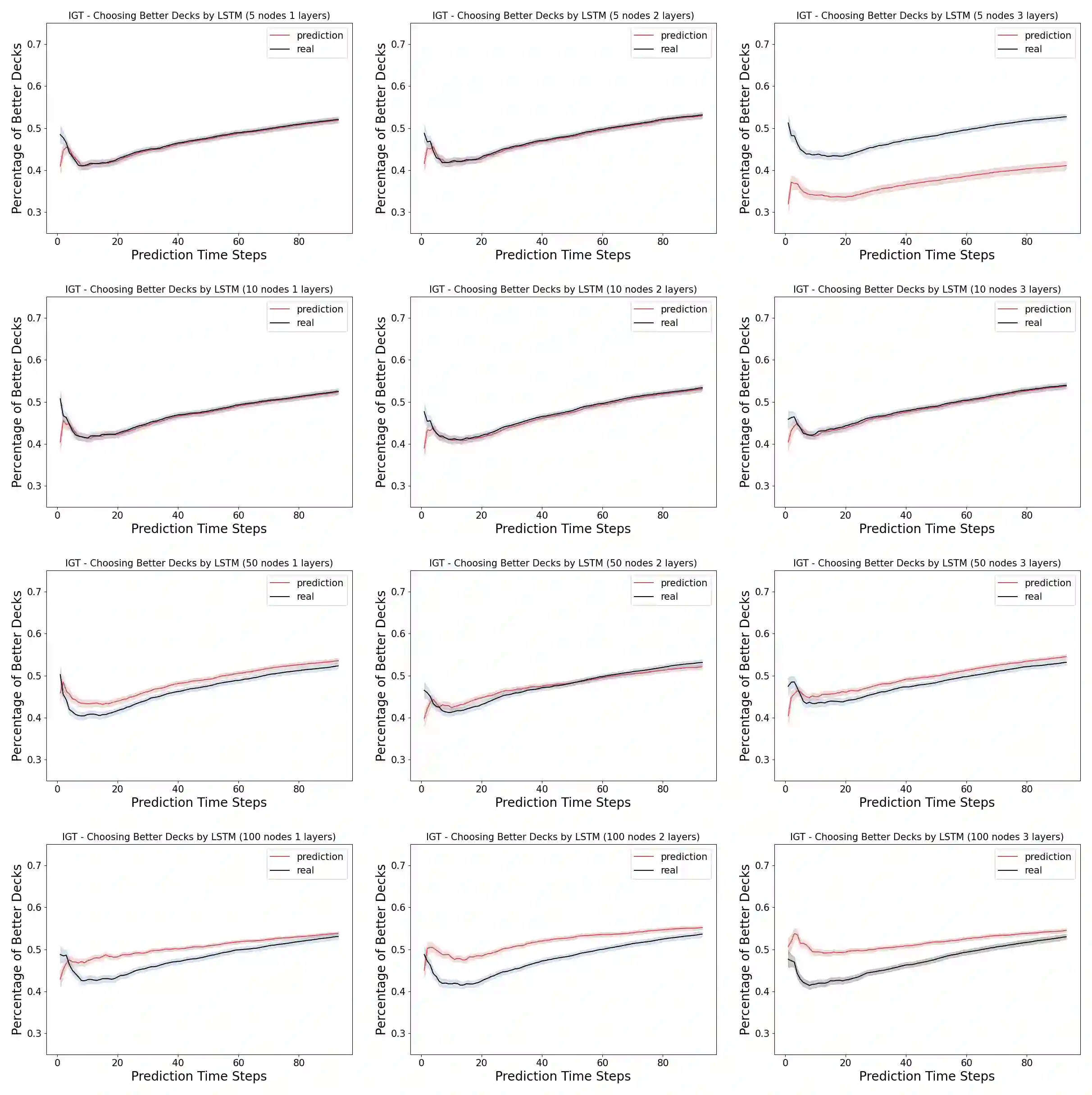 Unlike traditional time series, the action sequences of human decision making usually involve many cognitive processes such as beliefs, desires, intentions, and theory of mind, i.e., what others are thinking. This makes predicting human decision-making challenging to be treated agnostically to the underlying psychological mechanisms. We propose here to use a recurrent neural network architecture based on long short-term memory networks (LSTM) to predict the time series of the actions taken by human subjects engaged in gaming activity, the first application of such methods in this research domain. In this study, we collate the human data from 8 published literature of the Iterated Prisoner's Dilemma comprising 168,386 individual decisions and post-process them into 8,257 behavioral trajectories of 9 actions each for both players. Similarly, we collate 617 trajectories of 95 actions from 10 different published studies of Iowa Gambling Task experiments with healthy human subjects. We train our prediction networks on the behavioral data and demonstrate a clear advantage over the state-of-the-art methods in predicting human decision-making trajectories in both the single-agent scenario of the Iowa Gambling Task and the multi-agent scenario of the Iterated Prisoner's Dilemma. Moreover, we observe that the weights of the LSTM networks modeling the top performers tend to have a wider distribution compared to poor performers, as well as a larger bias, which suggest possible interpretations for the distribution of strategies adopted by each group.